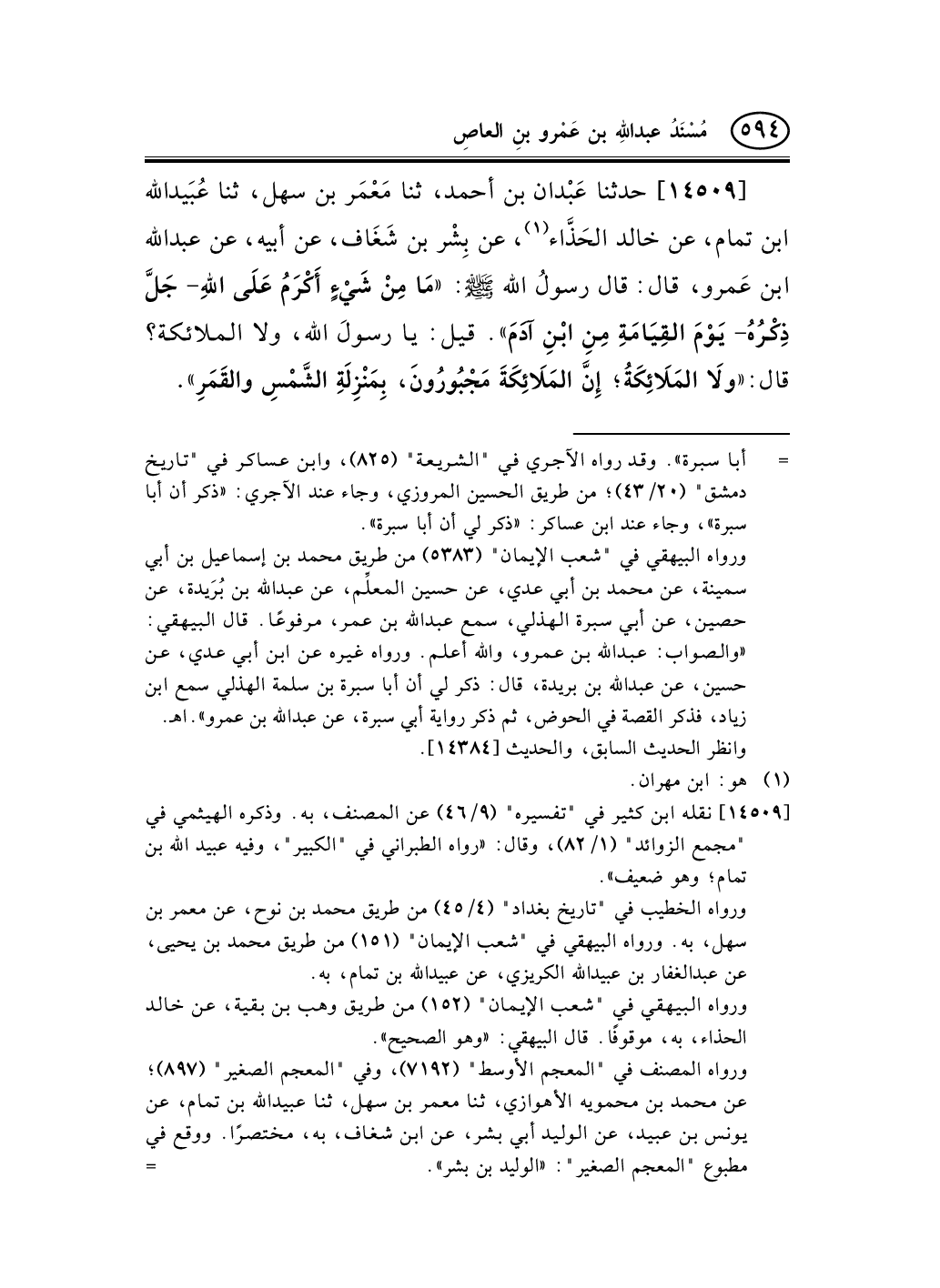 14509 - حدثنا عَبْدان بن أحمد، ثنا مَعْمَر بن سهل، ثنا عُبَيدالله ابن تمام، عن خالد الحَذَّاء (¬1) ، عن بِشْر بن شَغَاف، عن أبيه، عن عبد الله ابن عَمرو، قال: قال رسولُ الله صلى الله عليه وسلم: «مَا مِنْ شَيْءٍ أَكْرَمُ عَلَى اللهِ- جَلَّ ذِكْرُهُ- يَوْمَ القِيَامَةِ مِنِ ابْنِ آدَمَ» . قيل: يا رسولَ الله، ولا الملائكة؟ قال: «ولاَ المَلاَئِكَةُ؛ إِنَّ المَلاَئِكَةَ مَجْبُورُونَ، بِمَنْزِلَةِ الشَّمْسِ والقَمَرِ» .