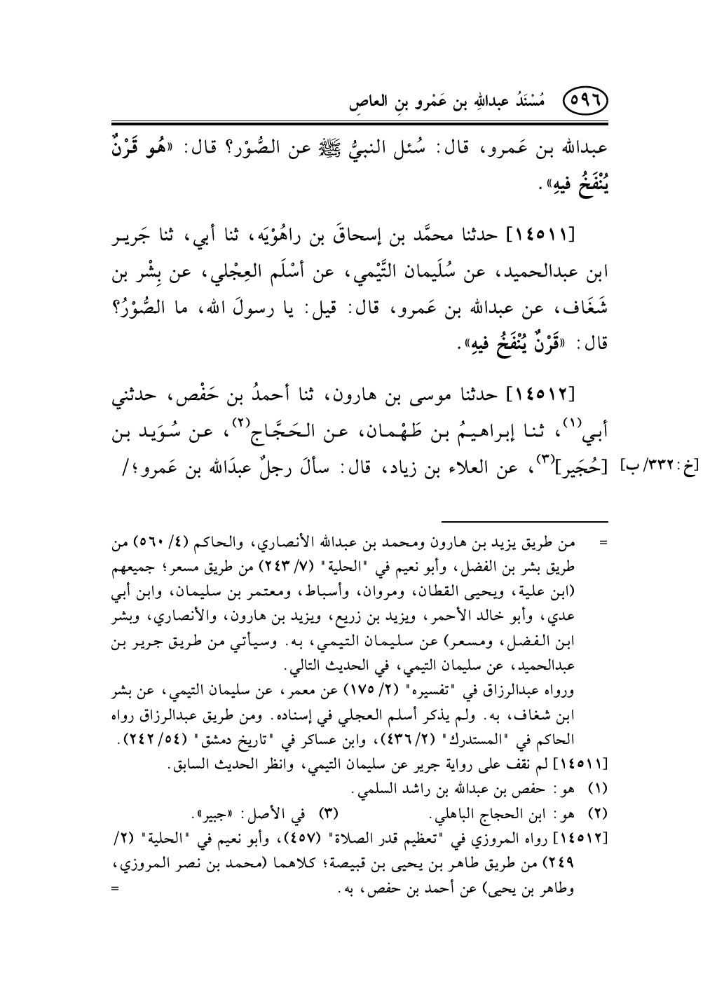 14511 - حدثنا محمَّد بن إسحاقَ بن راهُوْيَه، ثنا أبي، ثنا جَرير ابن عبد الحميد، عن سُلَيمان التَّيْمي، عن أسْلَم العِجْلي، عن بِشْر بن شَغَاف، عن عبد الله بن عَمرو، قال: قيل: يا رسولَ الله، ما الصُّوْرُ؟ قال: «قَرْنٌ يُنْفَخُ فيهِ» .