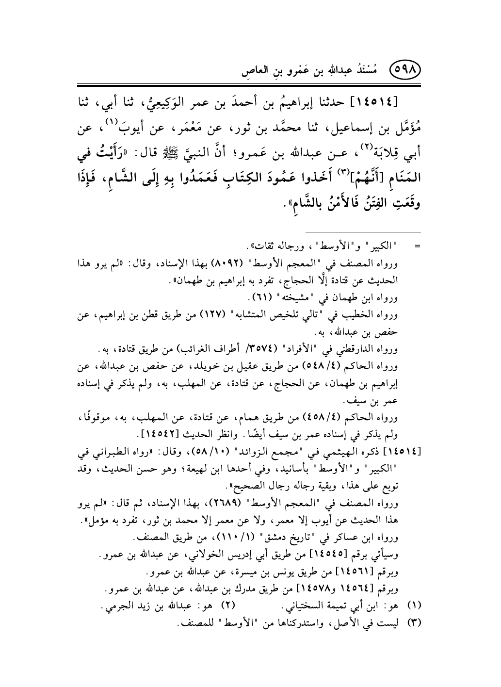 14514 - حدثنا إبراهيمُ بن أحمدَ بن عمر الوَكِيعِيُّ، ثنا أبي، ثنا مُؤَمَّل بن إسماعيل، ثنا محمَّد بن ثور، عن مَعْمَر، عن أيوبَ (¬1) ، عن أبي قِلابَة (¬2) ، عن عبد الله بن عَمرو؛ أنَّ النبيَّ صلى الله عليه وسلم قال: «رَأَيْتُ في المَنَامِ [أَنَّهُمْ] (¬3) أَخَذوا عَمُودَ الكِتَابِ فَعَمَدُوا بِهِ إِلَى الشَّامِ، فَإِذَا وقَعَتِ الفِتَنُ فَالأَمْنُ بالشَّامِ» .