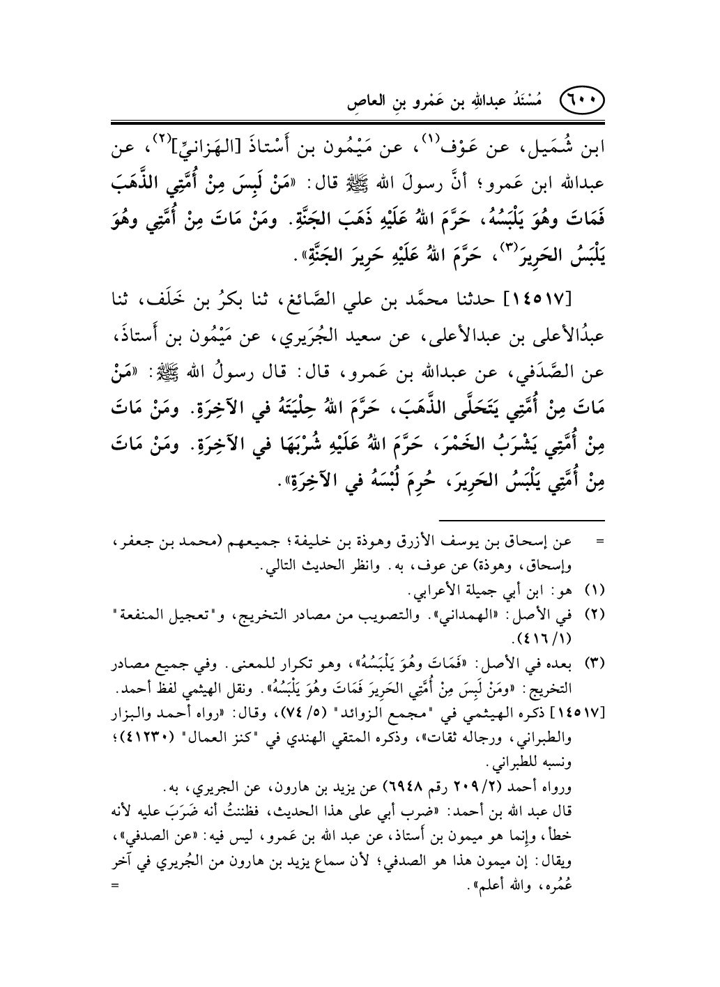 14517 - حدثنا محمَّد بن علي الصَّائغ، ثنا بكرُ بن خَلَف، ثنا عبدُالأعلى بن عبد الأعلى، عن سعيد الجُرَيري، عن مَيْمُون بن أَستاذَ، عن الصَّدَفي، عن عبد الله بن عَمرو، قال: قال رسولُ الله صلى الله عليه وسلم: «مَنْ مَاتَ مِنْ أُمَّتِي يَتَحَلَّى الذَّهَبَ، حَرَّمَ اللهُ حِلْيَتَهُ في الآخِرَةِ. ومَنْ مَاتَ مِنْ أُمَّتِي يَشْرَبُ الخَمْرَ، حَرَّمَ اللهُ عَلَيْهِ شُرْبَهَا في الآخِرَةِ. ومَنْ مَاتَ مِنْ أُمَّتِي يَلْبَسُ الحَرِيرَ، حُرِمَ لُبْسَهُ في الآخِرَةِ» .