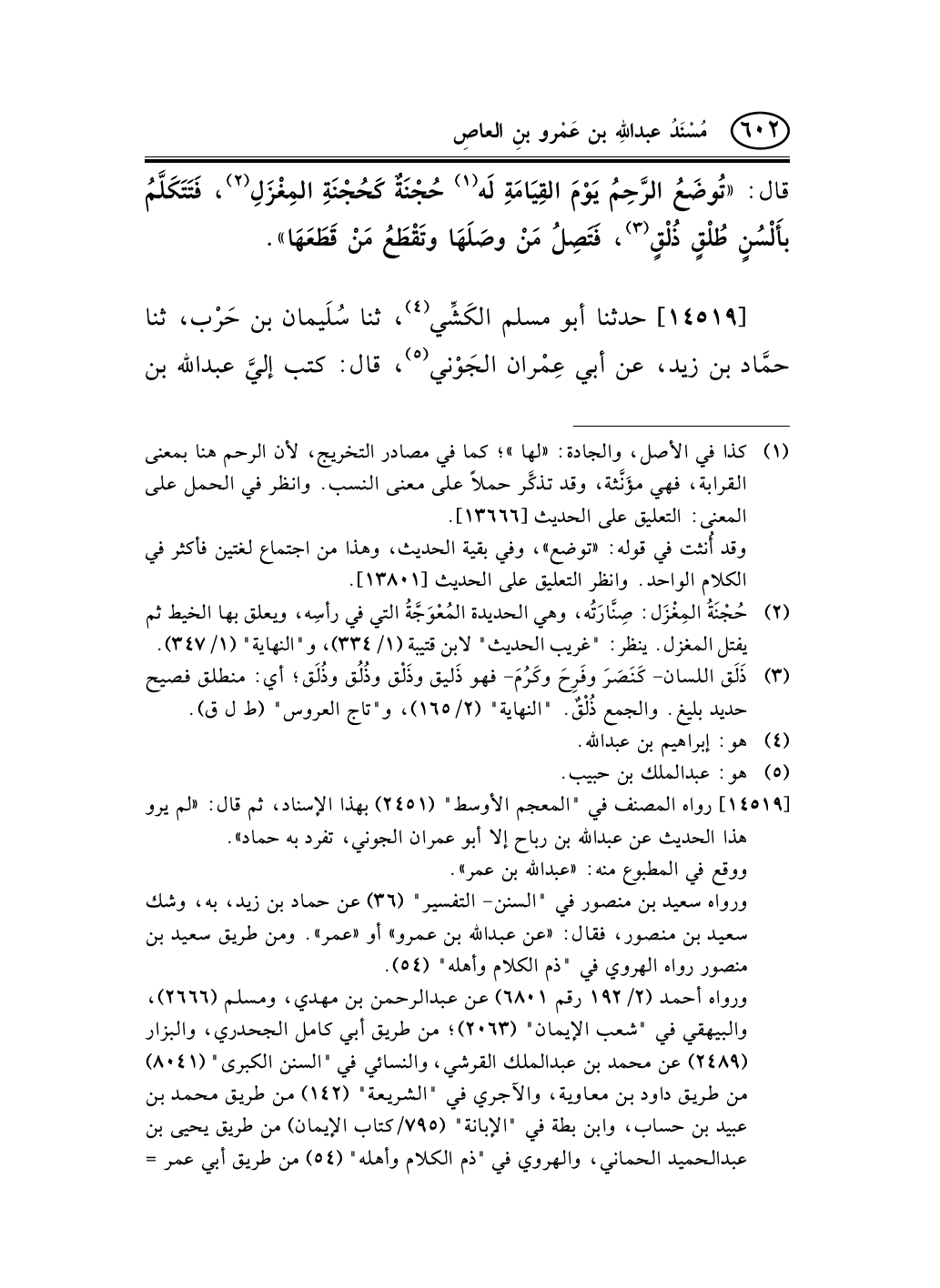 ورواه أحمد (2/192 رقم 6801) عن عبد الرحمن بن مهدي، ومسلم (2666) ، والبيهقي في "شعب الإيمان" (2063) ؛ من طريق أبي كامل الجحدري، والبزار (2489) عن محمد بن عبد الملك القرشي، والنسائي في "السنن الكبرى" (8041) من طريق داود بن معاوية، والآجري في "الشريعة" (142) من طريق محمد بن عبيد بن حساب، وابن بطة في "الإبانة" (795/كتاب الإيمان) من طريق يحيى بن عبد الحميد الحماني، والهروي في "ذم الكلام وأهله" (54) من طريق أبي عمر -[603]- الحوضي وسهل بن عثمان العسكري وأحمد بن المقدام؛ جميعهم (عبد الرحمن ابن مهدي، وأبو كامل الجحدري، ومحمد بن عبد الملك، وداود، ومحمد بن عبيد، ويحيى الحماني، وأبو عمر الحوضي، وسهل بن عثمان، وأحمد بن المقدام) عن حماد بن زيد، به. وانظر الحديثين [14177 و14247] .