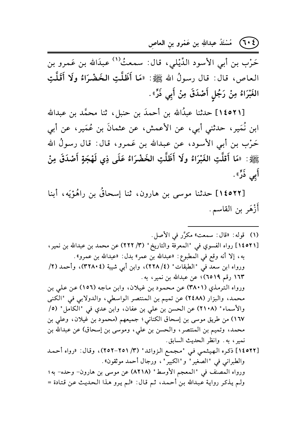14521 - حدثنا عبدُالله بن أحمدَ بن حنبل، ثنا محمَّد بن عبد الله ابن نُمَير، حدثني أبي، عن الأعمش، عن عثمانَ بن عُمَير، عن أبي حَرْب بن أبي الأسود، عن عبد الله بن عَمرو، قال: قال رسولُ الله صلى الله عليه وسلم: «مَا أَقلَّتِ الغَبْرَاءُ ولاَ أَظَلَّتِ الخَضْرَاءُ عَلَى ذِي لَهْجَةٍ أَصْدَقَ مِنْ أَبِي ذَرٍّ» .