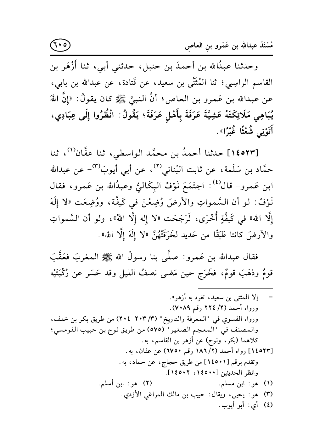 14523 - حدثنا أحمدُ بن محمَّد الواسطي، ثنا عفَّان (¬1) ، ثنا حمَّاد بن سَلَمة، عن ثابت البُناني (¬2) ، عن أبي أيوبَ (¬3) - عن عبد الله ابن عَمرو- قال (¬4) : اجتَمَعَ نَوْفٌ البِكَاليُّ وعبدُالله بن عَمرو، فقال نَوْفٌ: لو أن السَّمواتِ والأرضَ وُضِعْنَ في كَفَّة، ووُضِعَت «لا إِلَهَ إِلاَّ الله» في كَفَّةٍ أُخْرَى، لَرَجَحَت «لا إِله إِلاَّ اللهُ» ، ولو أن السَّمواتِ والأرضَ كانتا طَبَقًا من حَديد لخَرَقَتْهُنَّ «لا إِلَهَ إِلاَّ الله» .