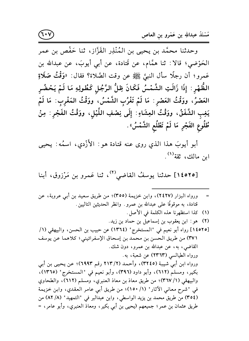 [14525] رواه أبو نعيم في "المستخرج" (1364) عن حبيب بن الحسن، والبيهقي (1/371) من طريق الحسن بن محمد بن إسحاق الإسفرائيني؛ كلاهما عن يوسف القاضي، به، عن عبد الله بن عمرو، دون شك.