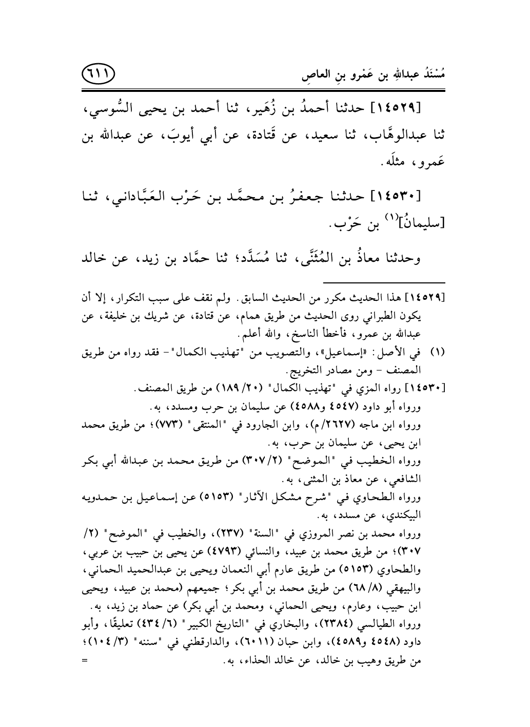 14529 - حدثنا أحمدُ بن زُهَير، ثنا أحمد بن يحيى السُّوسي، ثنا عبد الوهَّاب، ثنا سعيد، عن قَتادة، عن أبي أيوبَ، عن عبد الله بن عَمرو، مثلَه.