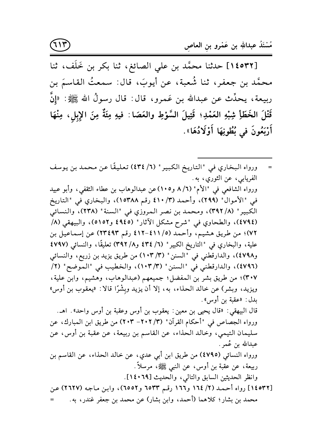 14532 - حدثنا محمَّد بن علي الصائغ، ثنا بكر بن خَلَف، ثنا محمَّد بن جعفر، ثنا شُعبة، عن أيوبَ، قال: سمعتُ القاسمَ بن ربيعة، يحدِّث عن عبد الله بن عَمرو، قال: قال رسولُ الله صلى الله عليه وسلم: «إِنَّ قَتْلَ الخَطَأِ شِبْهِ العَمْدِ؛ قَتِيلَ السَّوْطِ والعَصَا: فيهِ مِئَةٌ مِنَ الإِبِلِ، مِنْهَا أَرْبَعُونَ في بُطُونِهَا أَوْلاَدُهَا» .