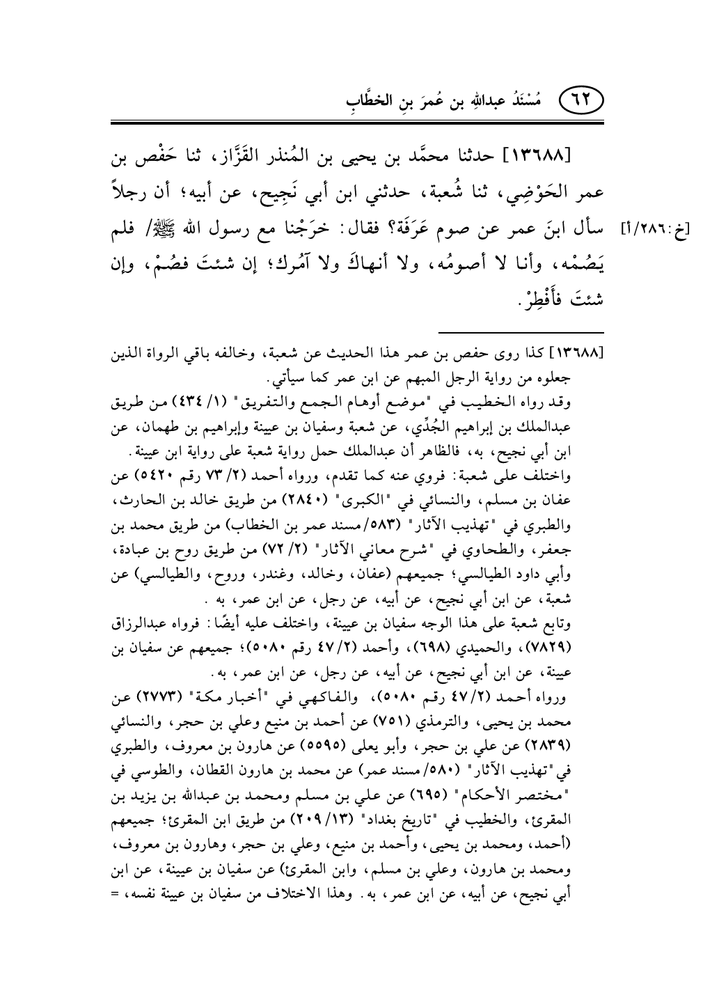 13688 - حدثنا محمَّد بن يحيى بن المُنذر القَزَّاز، ثنا حَفْص بن عمر الحَوْضِي، ثنا شُعبة، حدثني ابن أبي نَجِيح، عن أبيه؛ أن رجلاً سأل ابنَ عمر عن صوم عَرَفَة؟ فقال: خرَجْنا مع رسول الله صلى الله عليه وسلم/ فلم [خ: 286/أ]