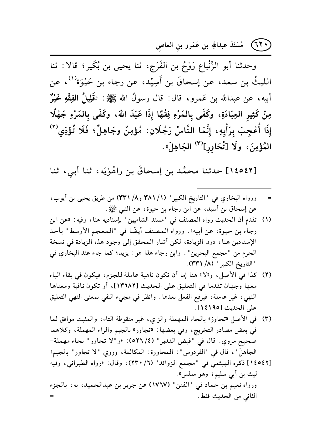 14542 - حدثنا محمَّد بن إسحاقَ بن راهُوْيَه، ثنا أبي، ثنا -[621]- جَرير (¬1) ، عن ليث (¬2) ، عن شَهْر بن حَوْشَب، عن عبد الله بن عَمرو، قال: سمعتُ رسولَ الله صلى الله عليه وسلم يقول: «إِنَّهُ كَائِنٌ فيكُمْ قَوْمٌ يَقْرَؤُونَ القُرْآنَ لاَ يُجَاوِزُ رُؤُوسَهُمْ، / كُلَّمَا (¬3) طَلَعَ مِنْهُمْ قَرْنٌ قُطِعَ، كُلَّمَا طَلَعَ مِنْهُمْ [خ: 334/ب]