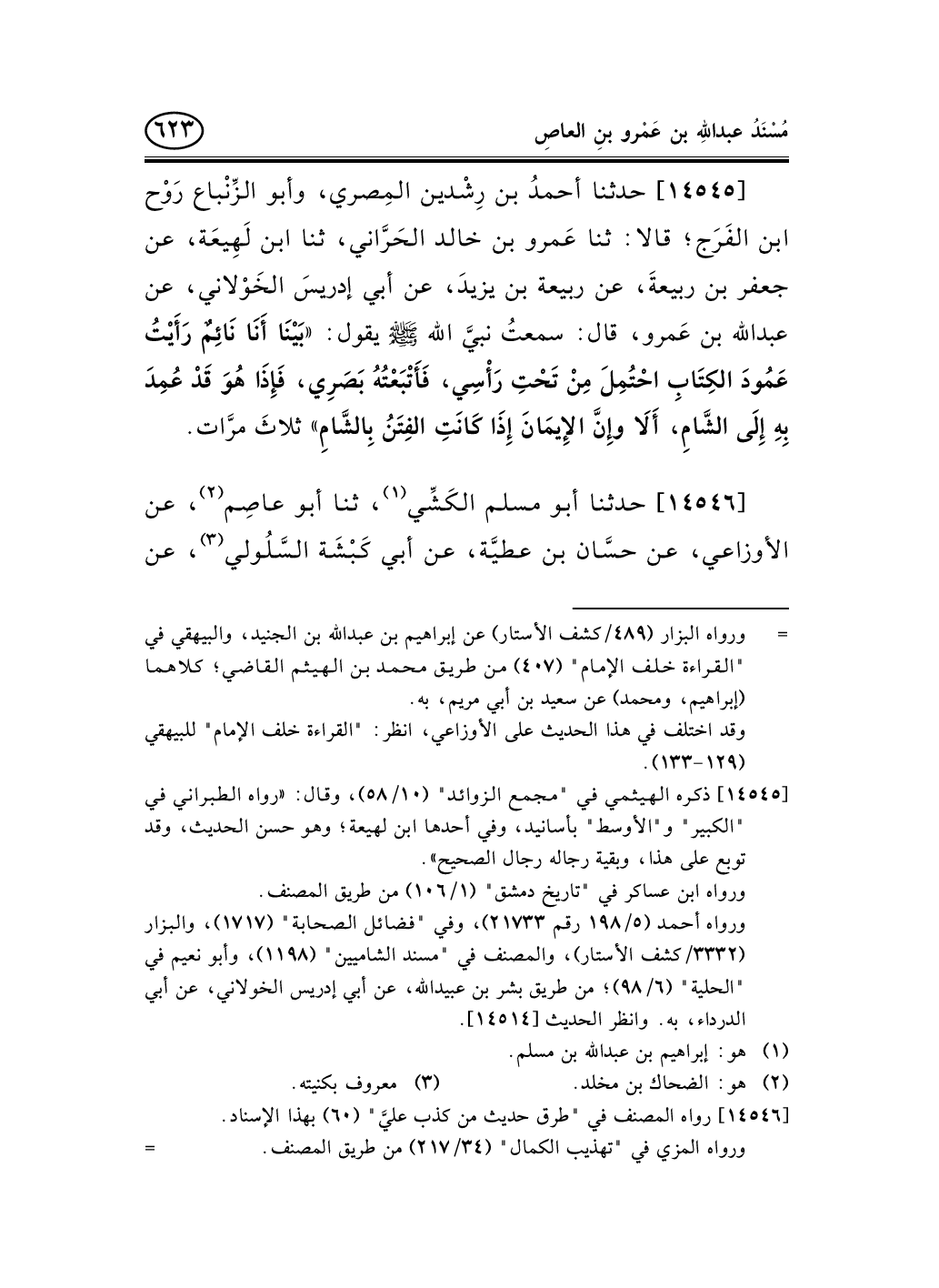 14545 - حدثنا أحمدُ بن رِشْدين المِصري، وأبو الزِّنْباع رَوْح ابن الفَرَج؛ قالا: ثنا عَمرو بن خالد الحَرَّاني، ثنا ابن لَهِيعَة، عن جعفر بن ربيعةَ، عن ربيعة بن يزيدَ، عن أبي إدريسَ الخَوْلاني، عن عبد الله بن عَمرو، قال: سمعتُ نبيَّ الله صلى الله عليه وسلم يقول: «بَيْنَا أَنَا نَائِمٌ رَأَيْتُ عَمُودَ الكِتَابِ احْتُمِلَ مِنْ تَحْتِ رَأْسِي، فَأَتْبَعْتُهُ بَصَرِي، فَإِذَا هُوَ قَدْ عُمِدَ بِهِ إِلَى الشَّامِ، أَلاَ وإِنَّ الإِيمَانَ إِذَا كَانَتِ الفِتَنُ بِالشَّامِ» ثلاثَ مرَّات.