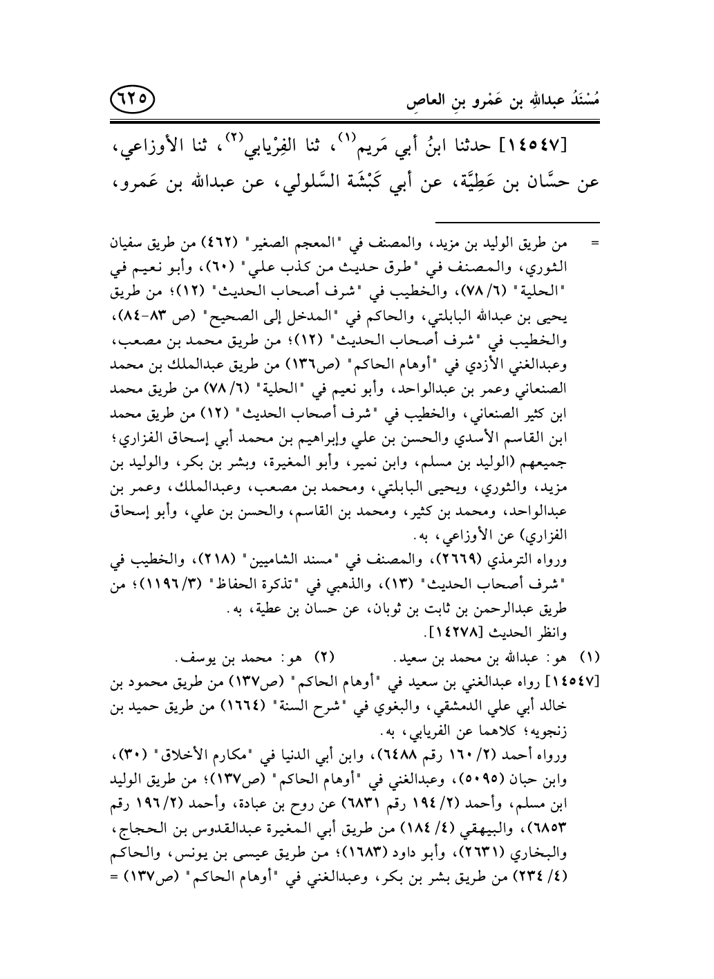 ورواه أحمد (2/160 رقم 6488) ، وابن أبي الدنيا في "مكارم الأخلاق" (30) ، وابن حبان (5095) ، وعبد الغني في "أوهام الحاكم" (ص137) ؛ من طريق الوليد ابن مسلم، وأحمد (2/194 رقم 6831) عن روح بن عبادة، وأحمد (2/196 رقم 6853) ، والبيهقي (4/184) من طريق أبي المغيرة عبد القدوس بن الحجاج، والبخاري (2631) ، وأبو داود (1683) ؛ من طريق عيسى بن يونس، والحاكم (4/234) من طريق بشر بن بكر، وعبد الغني في "أوهام الحاكم" (ص137) -[626]- من طريق عبد الحميد بن حبيب بن أبي العشرين وبقية بن الوليد، والبيهقي (4/184) من طريق الوليد بن مزيد؛ جميعهم (الوليد بن مسلم، وروح، وأبو المغيرة، وعيسى، وبشر، وعبد الحميد، وبقية، والوليد بن مزيد) عن الأوزاعي، به.
