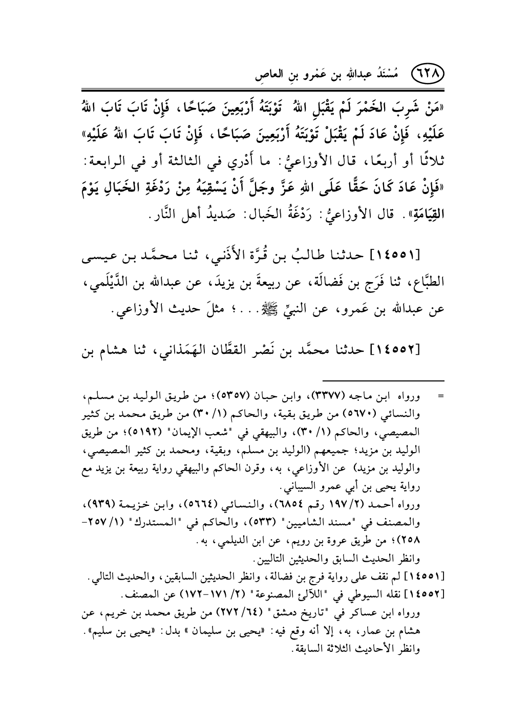 14552 - حدثنا محمَّد بن نَصْر القطَّان الهَمَذاني، ثنا هشام بن -[629]-[عمار] (¬1) ، ثنا عَمرو بن واقد، حدثني يحيى بن سُلَيم، عن أبي سلاَّم الحَبَشي، عن ابن الدَّيْلَمي، قال: أتيتُ عبدَالله بن عَمرو بن العاص، قلت: سمعت (¬2) رسولَ الله صلى الله عليه وسلم يقول: «مَنْ شَرِبَ الخَمْرَ رَجِسَ (¬3) ورَجِسَتْ صَلاَتُهُ أَرْبَعِينَ يَوْمًا، فَإِنْ تَابَ تَابَ اللهُ عَلَيْهِ، ثُمَّ إِنْ عَادَ رَجِسَ ورَجِسَتْ صَلاَتُهُ أَرْبَعِينَ يَوْمًا، ثُمَّ إِنْ تَابَ تَابَ اللهُ عَلَيْهِ، ثُمَّ إِنْ عَادَ رَجِسَ ورَجِسَتْ صَلاَتُهُ أَرْبَعِينَ يَوْمًا، فَإِنْ تَابَ تَابَ اللهُ عَلَيْهِ، فَإِنْ عَادَ كَانَ حَقًّا عَلَى اللهِ أَنْ يَسْقِيَهُ مِنْ رَدْغَةِ الخَبَالِ يَوْمَ القِيَامَةِ» .