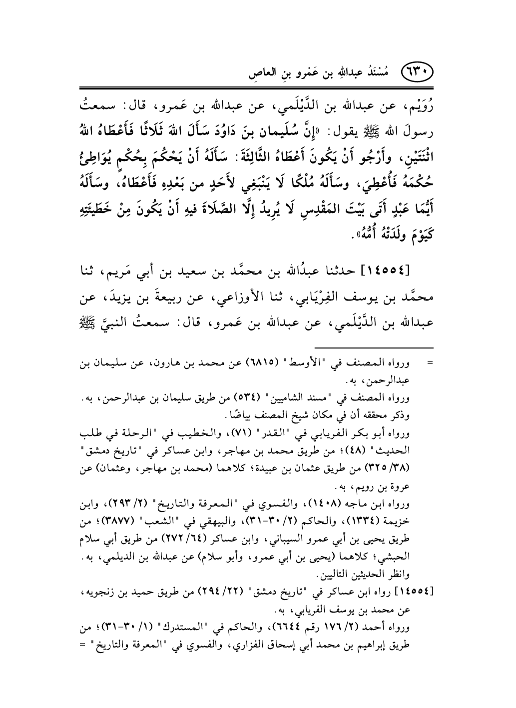 14554 - حدثنا عبدُالله بن محمَّد بن سعيد بن أبي مَريم، ثنا محمَّد بن يوسف الفِرْيَابي، ثنا الأوزاعي، عن ربيعةَ بن يزيدَ، عن عبد الله بن الدَّيْلَمي، عن عبد الله بن عَمرو، قال: سمعتُ النبيَّ صلى الله عليه وسلم -[631]- يقول: «إِنَّ سُلَيمانَ بنَ دَاوُدَ سَأَلَ رَبَّهُ ثَلاَثًا فَأَعْطَاهُ اثْنَتَيْنِ، وأَرْجُو أَنْ يَكُونَ قَدْ أَعْطاهُ الثَّالِثَةَ: سَأَلَ رَبَّهُ حُكْمًا يُصَادِفُ حُكْمَهُ فَأَعْطَاهُ، وسَأَلَهُ مُلْكًا لاَ يَنْبَغِي لأَحَدٍ مِنْ بَعْدِهِ فَأَعْطَاهُ، وسَأَلَ: أَيُّمَا رَجُلٍ خَرَجَ مِنْ بَيْتِهِ لاَ يُرِيدُ إِلاَّ الصَّلاَةَ في هَذَا المَسْجِدِ - يعني مسجدَ بيت المَقْدِس- أَنْ يَخْرُجَ مِنْ خَطِيئَتِهِ مِثْلَ يَوْمِ ولَدَتْهُ أُمُّهُ، ونَحْنُ نَرْجُو أَنْ يَكُونَ قَدْ أَعْطَاهُ ذَلِكَ» .