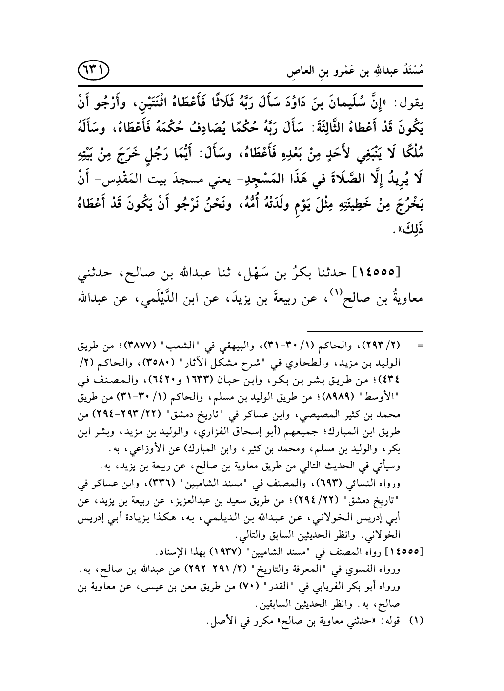 14555 - حدثنا بكرُ بن سَهْل، ثنا عبد الله بن صالح، حدثني معاويةُ بن صالح (¬1) ، عن ربيعةَ بن يزيدَ، عن ابن الدَّيْلَمي، عن عبد الله -[632]- ابن عَمرو، قال: سمعتُ رسولَ الله صلى الله عليه وسلم يقول: «إِنَّ سُلَيمانَ بنَ دَاوُدَ سَأَلَ اللهَ عَزَّ وجَلَّ ثَلاَثًا: سَأَلَهُ مُلْكًا لاَ يَنْبَغِي لأَحَدٍ مِنْ بَعْدِهِ فَأَعطَاهُ إِيَّاهُ، وسَأَلَهُ حُكْمًا يُصَادِفُ حُكْمَهُ فَأَعْطَاهُ، وسَأَلَهُ: مَنْ أَتَى هَذَا البَيْتَ لاَ يُرِيدُ إِلاَّ الصَّلاَةَ فيهِ أَنْ يَغْفِرَ لَهُ» .