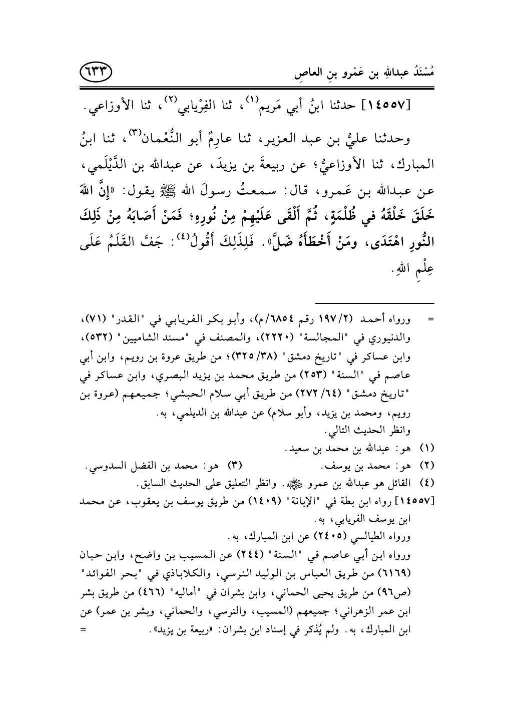وحدثنا عليُّ بن عبد العزير، ثنا عارِمٌ أبو النُّعْمان (¬3) ، ثنا ابنُ المبارك، ثنا الأوزاعيُّ؛ عن ربيعةَ بن يزيدَ، عن عبد الله بن الدَّيْلَمي، عن عبد الله بن عَمرو، قال: سمعتُ رسولَ الله صلى الله عليه وسلم يقول: «إِنَّ اللهَ خَلَقَ خَلْقَهُ في ظُلْمَةٍ، ثُمَّ أَلْقَى عَلَيْهِمْ مِنْ نُورِهِ؛ فَمَنْ أَصَابَهُ مِنْ ذَلِكَ النُّورِ اهْتَدَى، ومَنْ أَخْطَأَهُ ضَلَّ» . فَلِذَلِكَ أَقُولُ (¬4) : جَفَّ القَلَمُ عَلَى عِلْمِ اللهِ.
