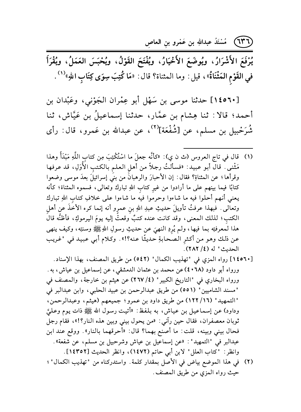 14560 - حدثنا موسى بن سَهْل أبو عِمْران الجَوْني، وعَبْدان بن أحمد؛ قالا: ثنا هِشام بن عمَّار، حدثنا إسماعيلُ بن عَيَّاش، ثنا شُرَحْبيل بن مسلم، عن [شُفْعَة] (¬1) ، عن عبد الله بن عَمرو، قال: رأى -[637]- عليَّ رسولُ الله صلى الله عليه وسلم ثوبًا مَصْبوغًا، فقال: «مَا هَذَا؟» ، فانطَلَقتُ فأحرَقتُه، فقال النبيُّ صلى الله عليه وسلم: «مَا صَنَعْتَ بِثَوْبِكَ؟» ، قلتُ: أحرَقتُه، قال: «أَلاَ كَسَوْتَهُ بَعْضَ نِسَائِكَ؟!» .