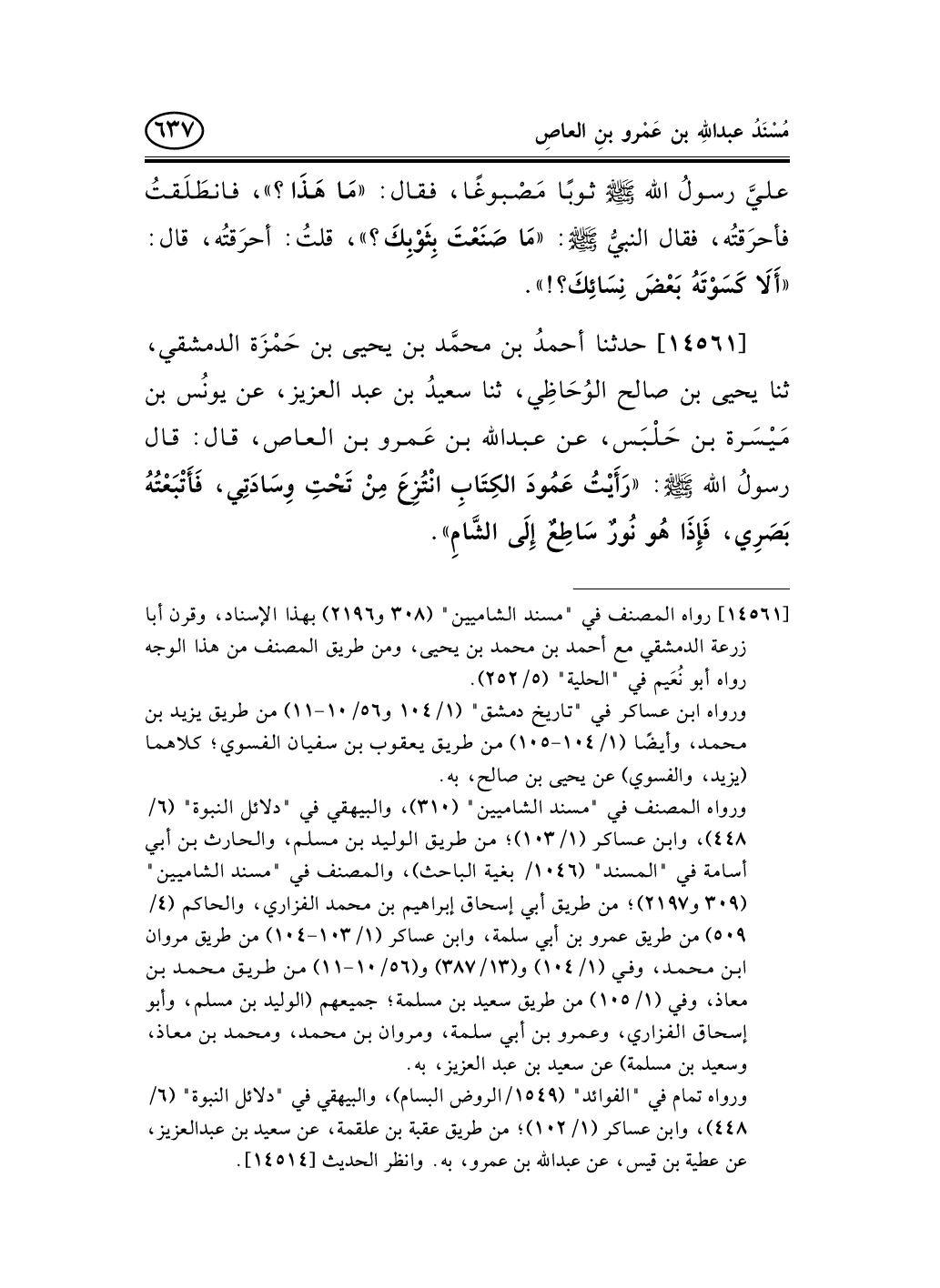 14561 - حدثنا أحمدُ بن محمَّد بن يحيى بن حَمْزَة الدمشقي، ثنا يحيى بن صالح الوُحَاظِي، ثنا سعيدُ بن عبد العزيز، عن يونُس بن مَيْسَرة بن حَلْبَس، عن عبد الله بن عَمرو بن العاص، قال: قال رسولُ الله صلى الله عليه وسلم: «رَأَيْتُ عَمُودَ الكِتَابِ انْتُزِعَ مِنْ تَحْتِ وِسَادَتِي، فَأَتْبَعْتُهُ بَصَرِي، فَإِذَا هُو نُورٌ سَاطِعٌ إِلَى الشَّامِ» .
