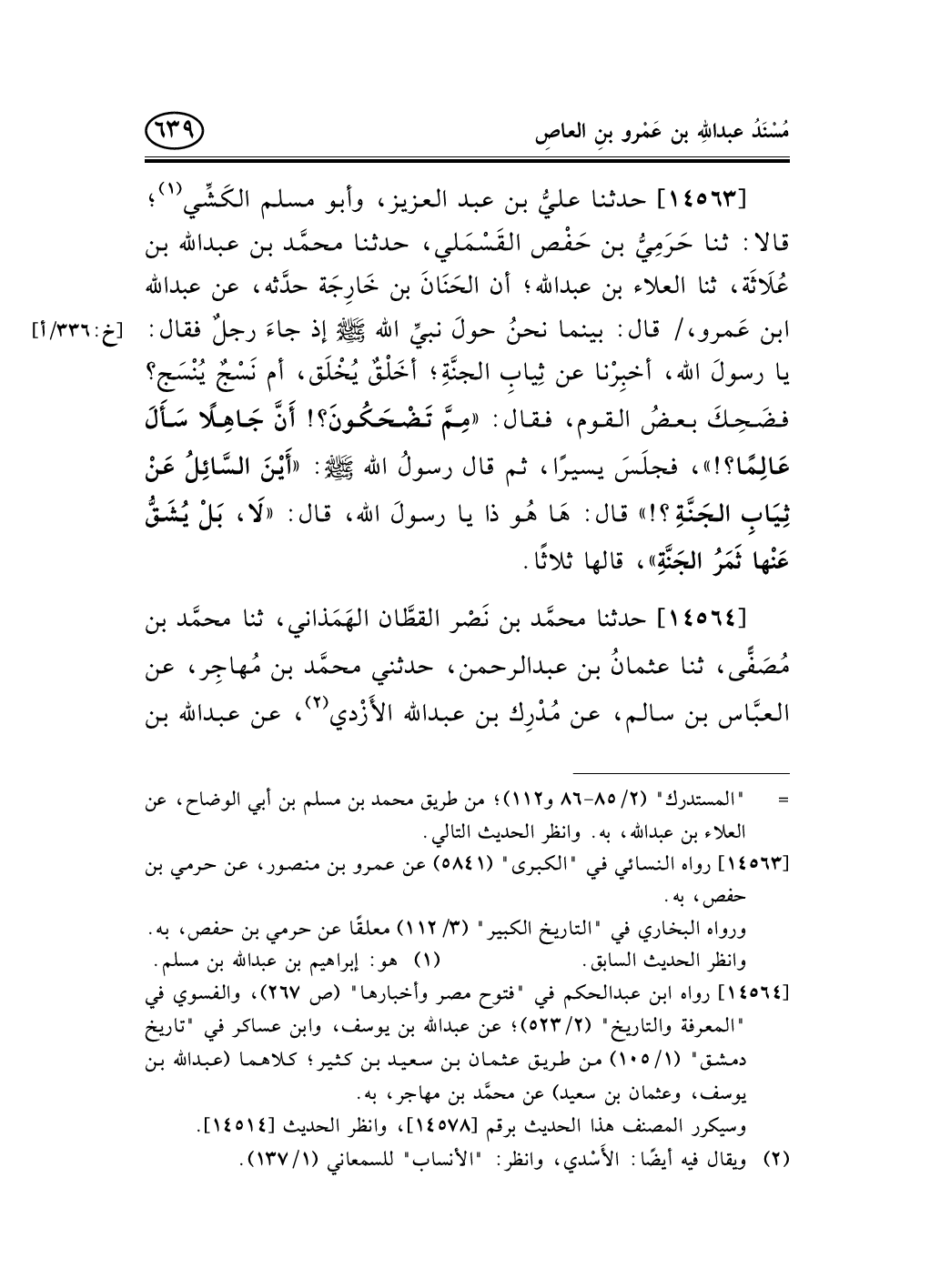 14563 - حدثنا عليُّ بن عبد العزيز، وأبو مسلم الكَشِّي (¬1) ؛ قالا: ثنا حَرَمِيُّ بن حَفْص القَسْمَلي، حدثنا محمَّد بن عبد الله بن عُلاَثَة، ثنا العلاء بن عبد الله؛ أن الحَنَانَ بن خَارِجَة حدَّثه، عن عبد الله ابن عَمرو، / قال: بينما نحنُ حولَ نبيِّ الله صلى الله عليه وسلم إذ جاءَ رجلٌ فقال: [خ: 336/أ]