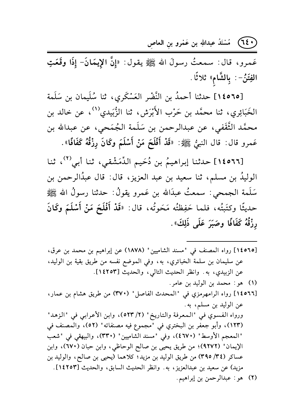 14566 - حدثنا إبراهيمُ بن دُحَيم الدِّمَشْقي، ثنا أبي (¬1) ، ثنا الوليدُ بن مسلم، ثنا سعيد بن عبد العزيز، قال: قال عبدُالرحمن بن سَلَمة الجمحي: سمعتُ عبدَالله بن عَمرو يقولُ: حدثنا رسولُ الله صلى الله عليه وسلم حديثًا وكتَبتُه، فلما حَفِظتُه مَحَوتُه، قال: «قَدْ أَفْلَحَ مَنْ أَسْلَمَ وكَانَ رِزْقُهُ كَفَافًا وصَبَرَ عَلَى ذَلِكَ» .
