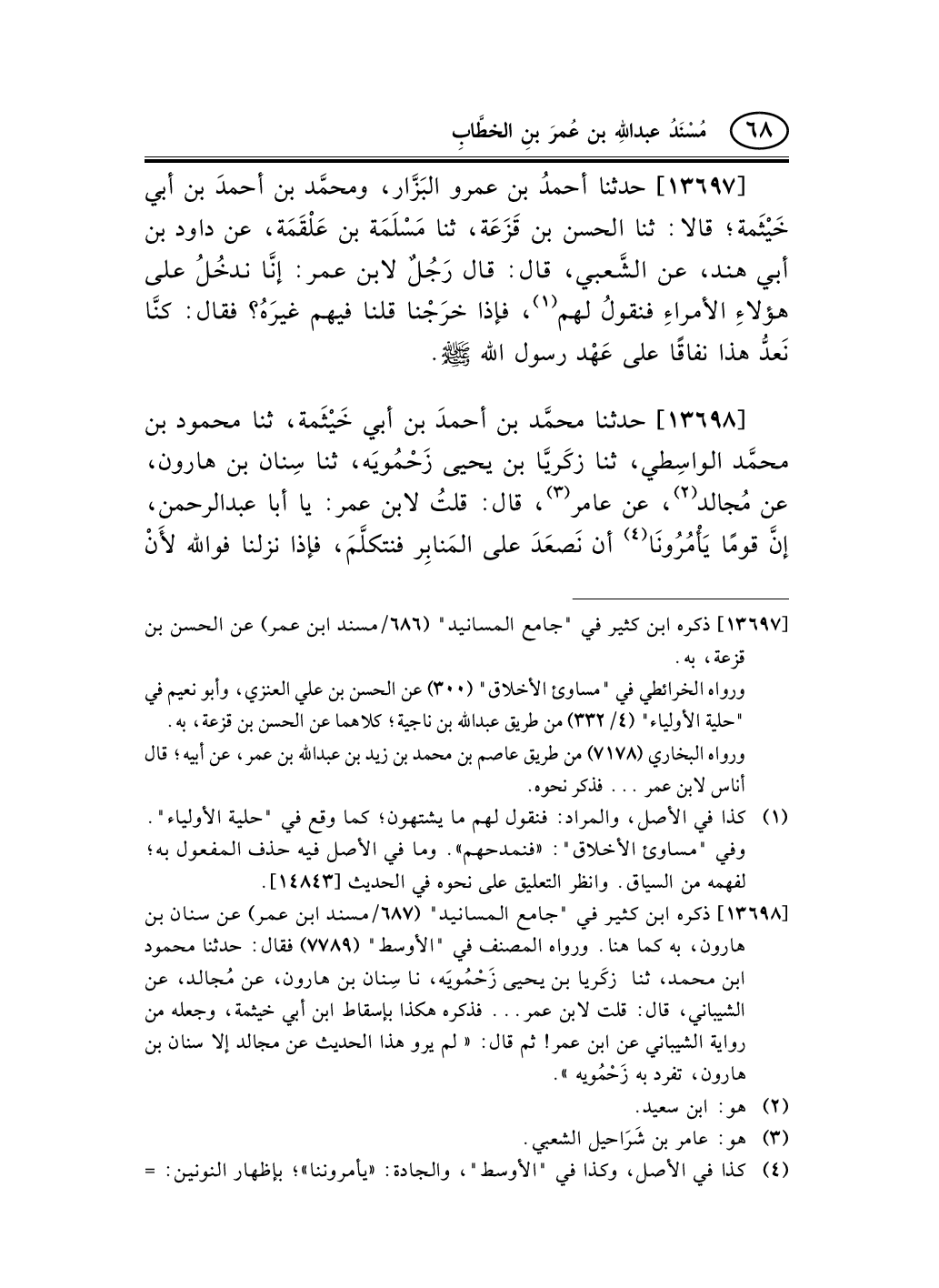 13698 - حدثنا محمَّد بن أحمدَ بن أبي خَيْثَمة، ثنا محمود بن محمَّد الواسِطي، ثنا زكَريَّا بن يحيى زَحْمُويَه، ثنا سِنان بن هارون، عن مُجالد (¬1) ، عن عامر (¬2) ، قال: قلتُ لابن عمر: يا أبا عبد الرحمن، إنَّ قومًا يَأْمُرُونَا (¬3) أن نَصعَدَ على المَنابِر فنتكلَّمَ، فإذا نزلنا فوالله لأَنْ -[69]- يَخِرَّ أحدُنا من السماء أحبُّ إليه من أن يَلفِظَ بشيء منها (¬4) ؟ قال: كان هذا على عَهْد رسول الله صلى الله عليه وسلم نِفاقًا.