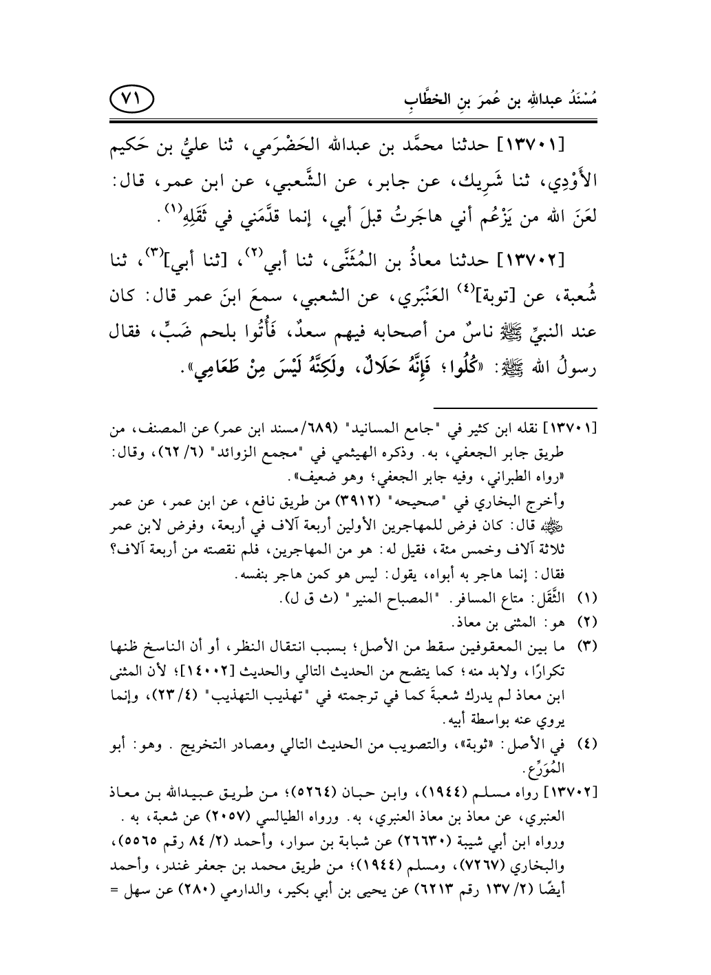 [13701] نقله ابن كثير في "جامع المسانيد" (689/مسند ابن عمر) عن المصنف، من طريق جابر الجعفي، به. وذكره الهيثمي في "مجمع الزوائد" (6/62) ، وقال: «رواه الطبراني، وفيه جابر الجعفي؛ وهو ضعيف» .