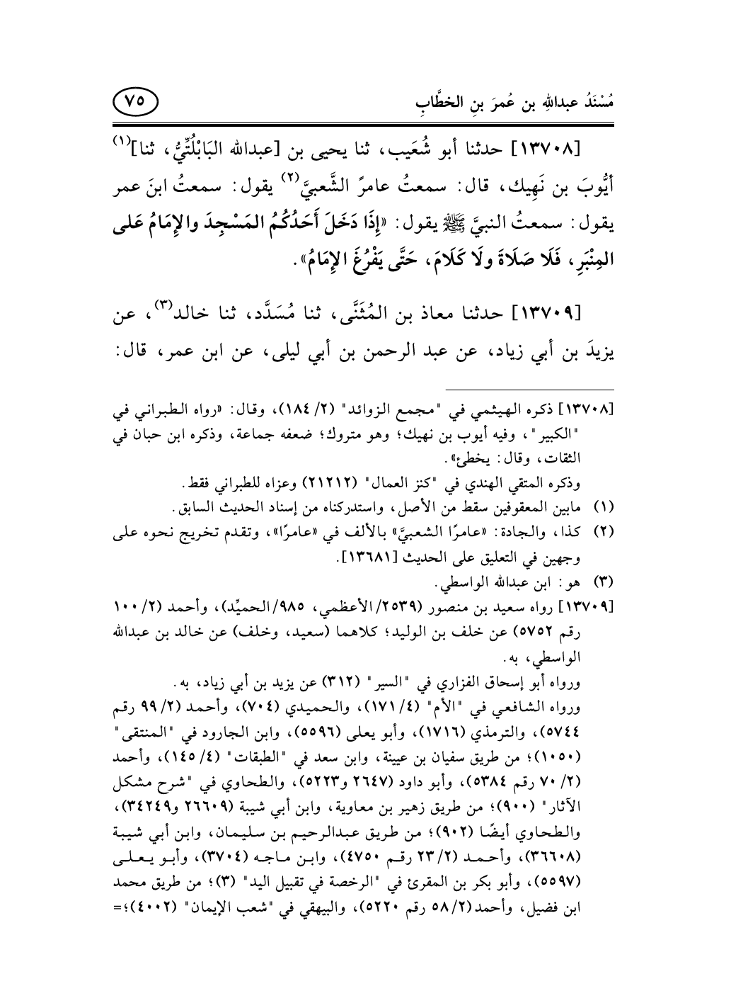 13708 - حدثنا أبو شُعَيب، ثنا يحيى بن [عبد الله البَابْلُتِّيُّ، ثنا] (¬1) أيُّوبَ بن نَهِيك، قال: سمعتُ عامرً الشَّعبيَّ (¬2) يقول: سمعتُ ابنَ عمر يقول: سمعتُ النبيَّ صلى الله عليه وسلم يقول: «إِذَا دَخَلَ أَحَدُكُمُ المَسْجِدَ والإِمَامُ عَلى المِنْبَرِ، فَلاَ صَلاَةَ ولاَ كَلاَمَ، حَتَّى يَفْرُغَ الإِمَامُ» .