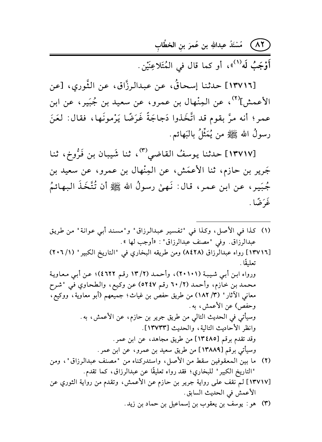13716 - حدثنا إسحاقُ، عن عبد الرزَّاق، عن الثَّوري، [عن الأعمش] (¬1) ، عن المِنْهال بن عمرو، عن سعيد بن جُبَير، عن ابن عمر؛ أنه مرَّ بقوم قد اتَّخَذوا دَجاجَةً غَرَضًا يَرْمونَها، فقال: لعَنَ رسولُ الله صلى الله عليه وسلم من يُمَثِّلُ بالبَهائم.
