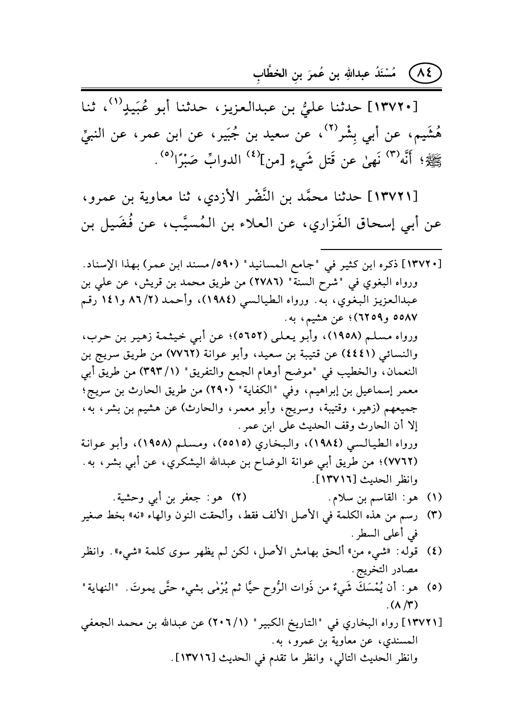 13720 - حدثنا عليُّ بن عبد العزيز، حدثنا أبو عُبَيدٍ (¬1) ، ثنا هُشَيم، عن أبي بِشْر (¬2) ، عن سعيد بن جُبَير، عن ابن عمر، عن النبيِّ صلى الله عليه وسلم؛ أَنَّه (¬3) نَهى عن قَتل شَيءٍ [من] (¬4) الدوابِّ صَبْرًا (¬5) .