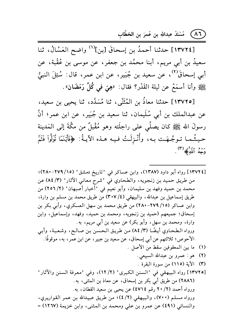 13725 - حدثنا معاذُ بن المُثَنَّى، ثنا مُسَدَّد، ثنا يحيى بن سعيد، عن عبد الملك بن أبي سُلَيمان، ثنا سعيد بن جُبَير، عن ابن عمر؛ أنَّ رسولَ الله صلى الله عليه وسلم كان يصلِّي على راحِلَته وهو مُقْبلٌ من مكَّةَ إلى المَدينة حيثُما توجَّهَت به، وأُنْزِلَتْ فيه هذه الآيةُ: {فَأَيْنَمَا تُوَلُّوا فَثَمَّ وَجْهُ اللَّهِ} (¬1) .