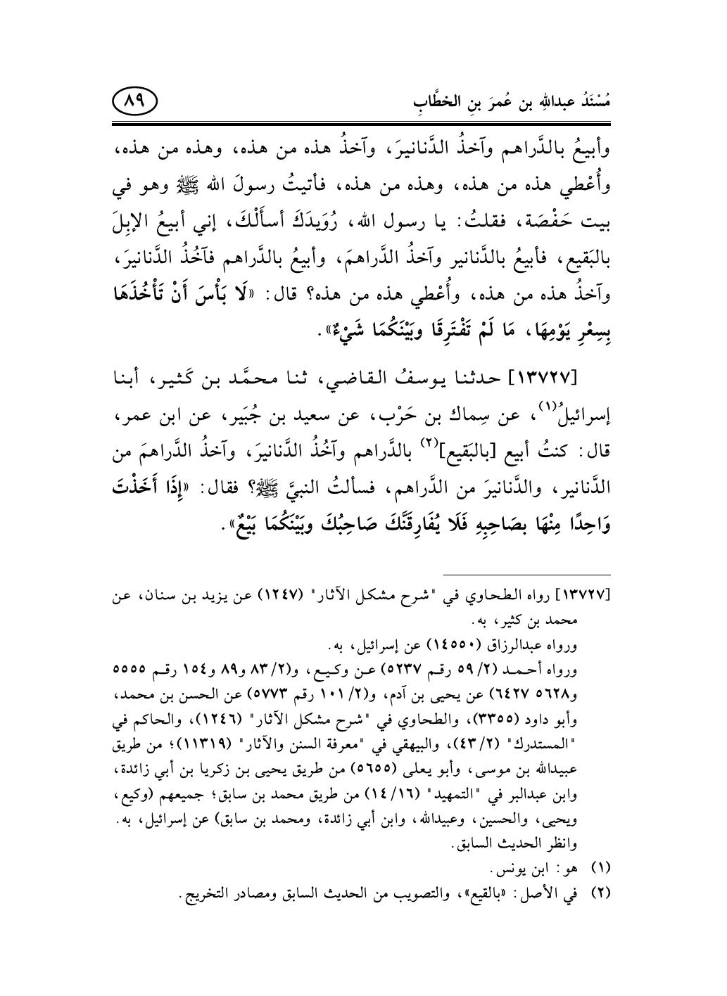 13727 - حدثنا يوسفُ القاضي، ثنا محمَّد بن كَثير، أبنا إسرائيلُ (¬1) ، عن سِماك بن حَرْب، عن سعيد بن جُبَير، عن ابن عمر، قال: كنتُ أبيع [بالبَقيع] (¬2) بالدَّراهم وآخُذُ الدَّنانيرَ، وآخذُ الدَّراهمَ من الدَّنانير، والدَّنانيرَ من الدَّراهم، فسألتُ النبيَّ صلى الله عليه وسلم؟ فقال: «إِذَا أَخَذْتَ وَاحِدًا مِنْهَا بصَاحِبِهِ فَلاَ يُفَارِقَنَّكَ صَاحِبُكَ وبَيْنَكُمَا بَيْعٌ» .