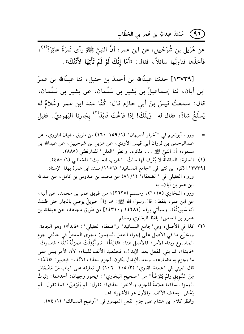 13739 - حدثنا عبدُالله بن أحمدَ بن حنبل، ثنا عبدُالله بن عمرَ ابن أبان، ثنا إسماعيلُ بن بَشير بن سَلْمان، عن بَشير بن سَلْمان، قال: سمعتُ قيسَ بنَ أبي حازم قال: كُنَّا عند ابن عمر وغُلامٌ له يَسلَخُ شاةً، فقال له: وَيلَكَ! إذا فرَغْتَ فَابْدَ (¬1) بِجَارِنا اليَهوديِّ. فقيل -[97]- له: يا أبا عبد الرحمن، كم تَذكُر هذا اليهوديَّ! قال: إني سمعتُ رسولَ الله صلى الله عليه وسلم يُوصي بالجار حتى ظننتُ أنه سَيُوَرِّثُه.