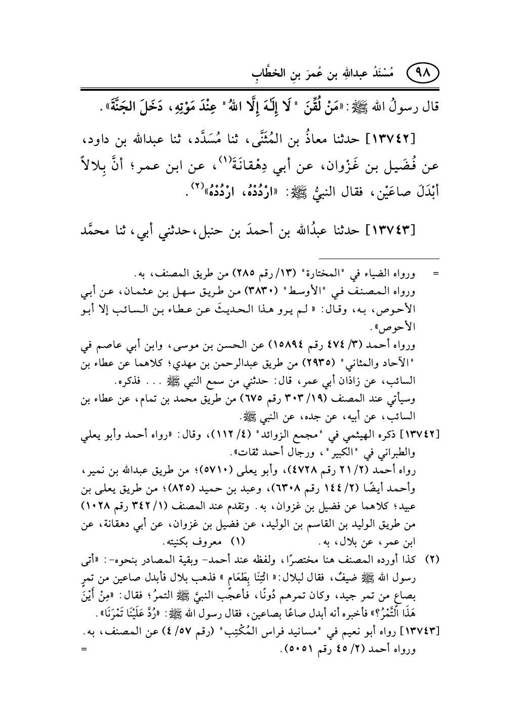 13742 - حدثنا معاذُ بن المُثَنَّى، ثنا مُسَدَّد، ثنا عبد الله بن داود، عن فُضَيل بن غَزْوان، عن أبي دِهْقانَةَ (¬1) ، عن ابن عمر؛ أنَّ بِلالاً أبْدَلَ صاعَيْن، فقال النبيُّ صلى الله عليه وسلم: «ارْدُدْهُ، ارْدُدْهُ» (¬2) .