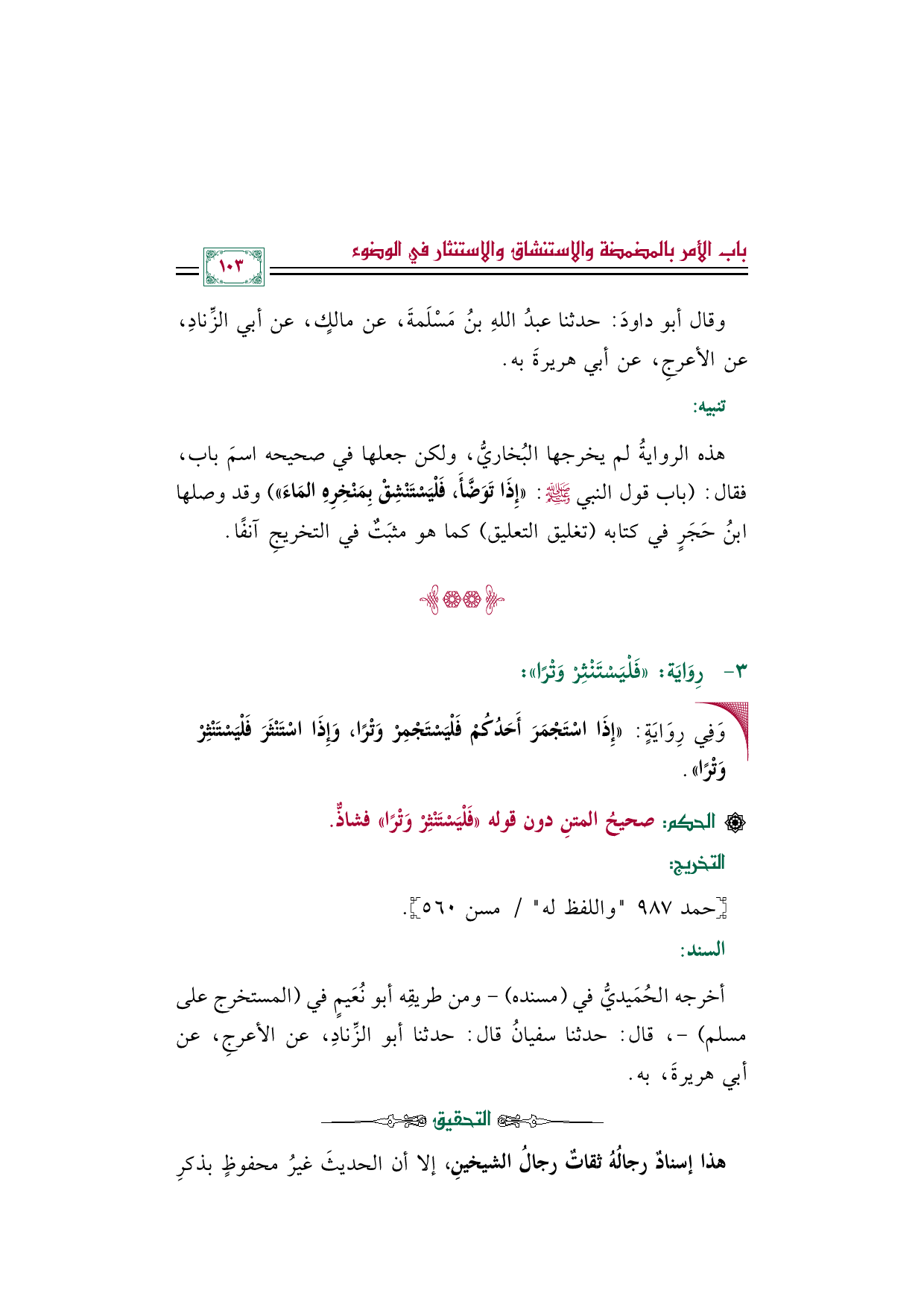 وقال أبو داودَ: حدثنا عبدُ اللهِ بنُ مَسْلَمةَ، عن مالكٍ، عن أبي الزِّنادِ، عن الأعرجِ، عن أبي هريرةَ به.