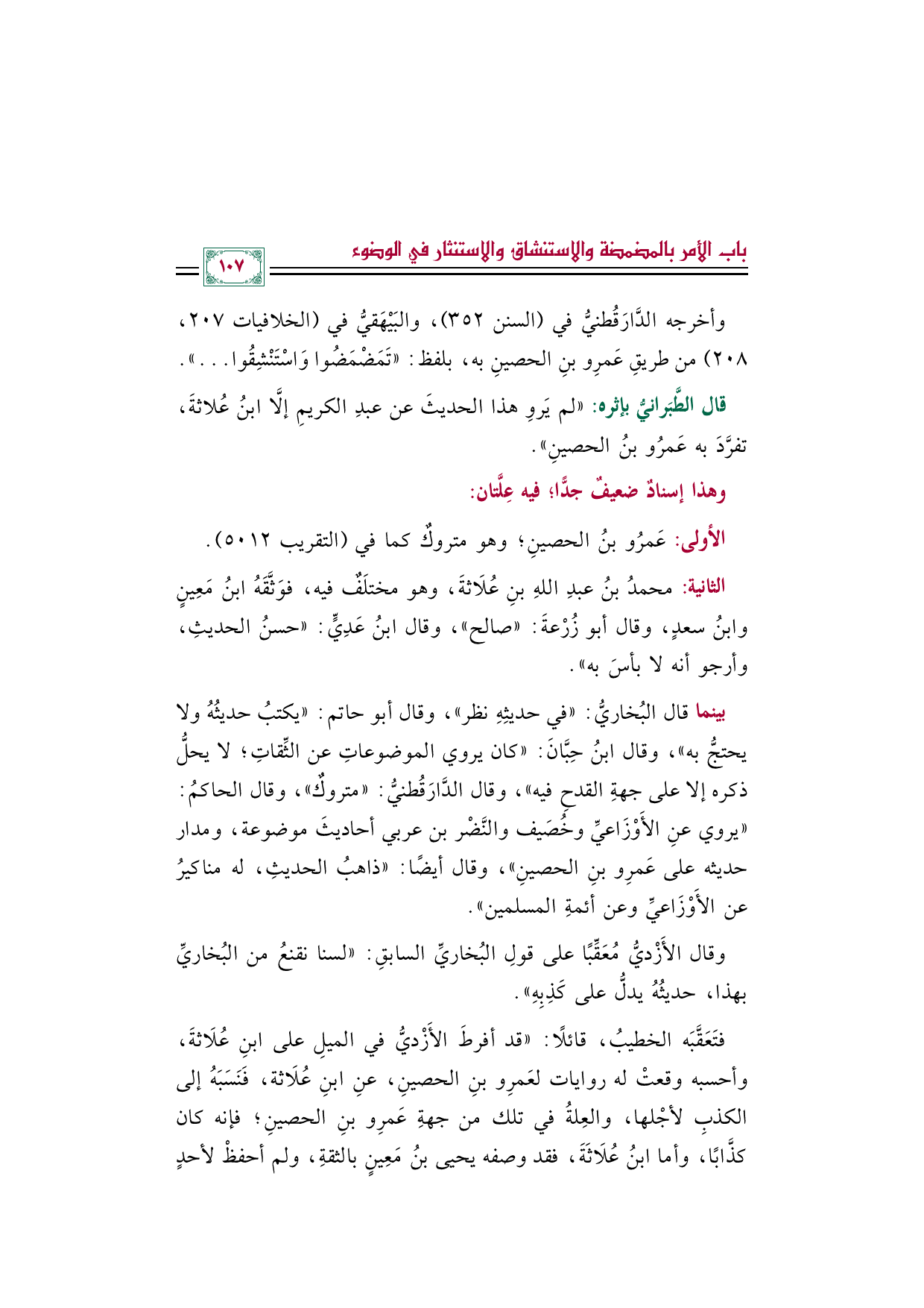 وأخرجه الدَّارَقُطنيُّ في (السنن ٣٥٢)، والبَيْهَقيُّ في (الخلافيات ٢٠٧، ٢٠٨) من طريقِ عَمرِو بنِ الحصينِ به، بلفظ: ((تَمَضْمَضُوا وَاسْتَنْشِقُوا ... )).