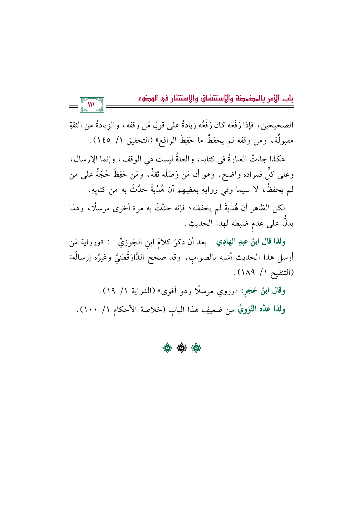 ولذا قال ابنُ عبدِ الهادِي -بعد أن ذكرَ كلامَ ابنِ الجَوزيِّ-: "ورواية مَن أرسل هذا الحديث أشبه بالصوابِ، وقد صحح الدَّارَقُطنيُّ وغيرُه إرسالَه" (التنقيح ١/ ١٨٩).