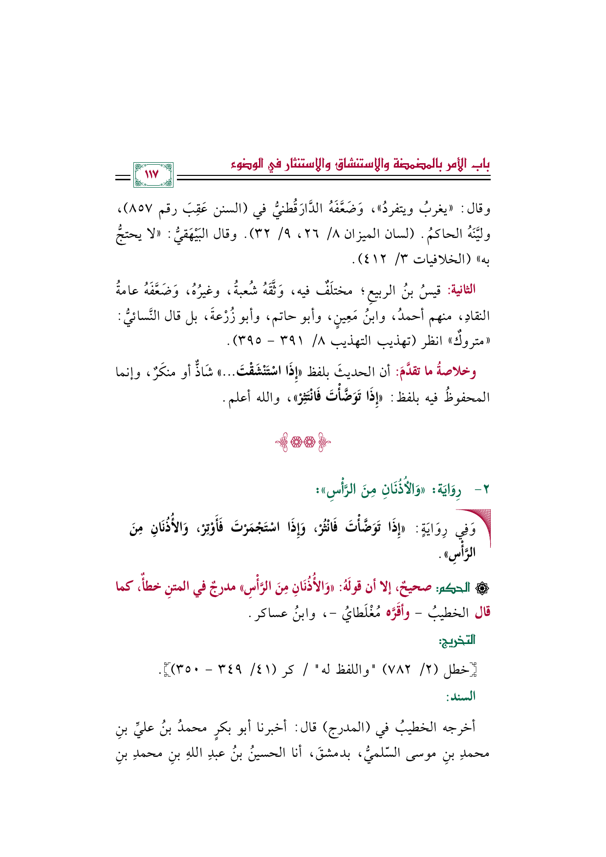 وخلاصةُ ما تقدَّمَ: أن الحديثَ بلفظ ((إِذَا اسْتَنْشَقْتَ ... )) شَاذٌّ أو منكَرٌ، وإنما المحفوظُ فيه بلفظ: ((إِذَا تَوَضَّأْتَ فَانْتَثِرْ))، والله أعلم.