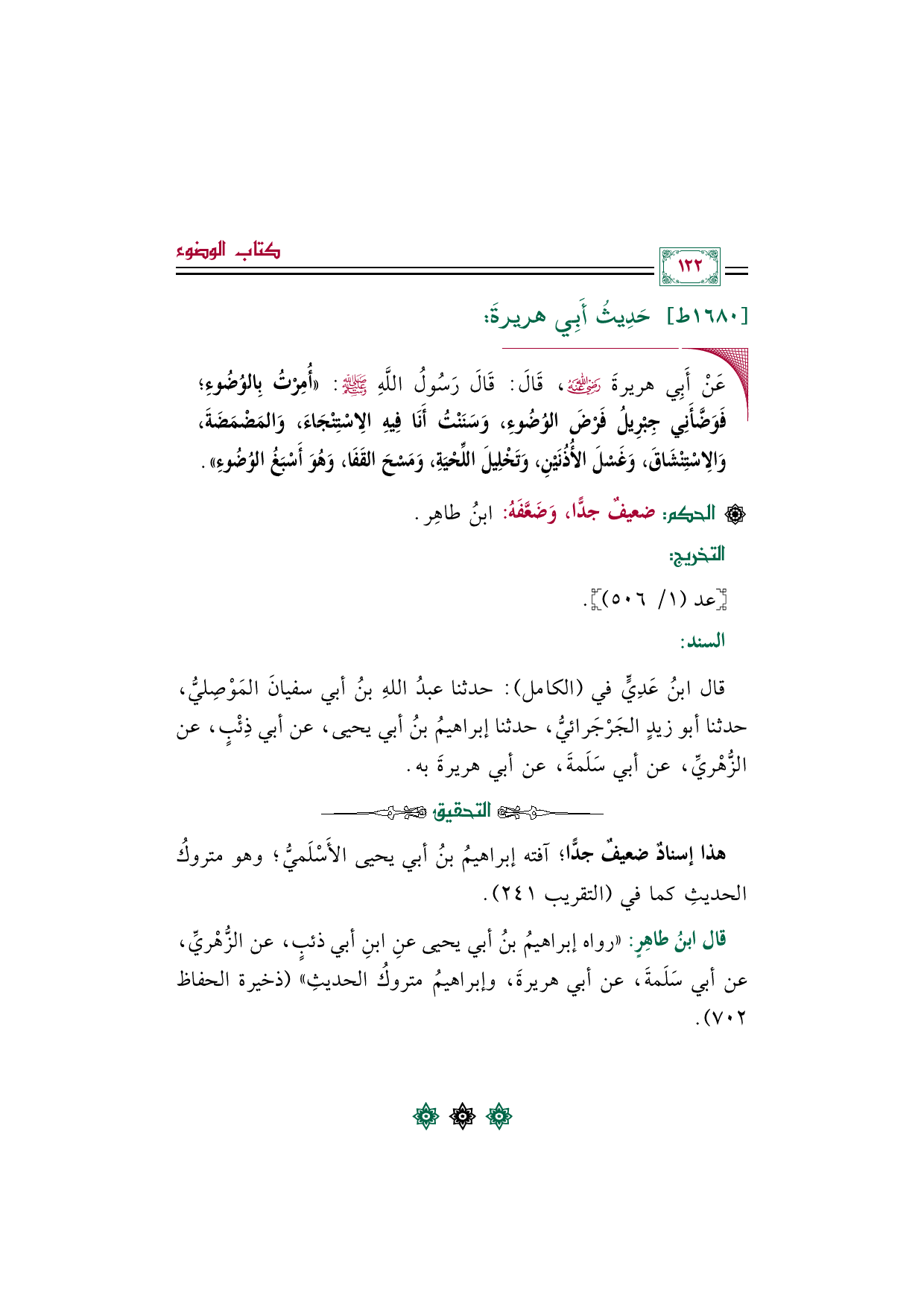 قال ابنُ طاهِرٍ: "رواه إبراهيمُ بنُ أبي يحيى عنِ ابنِ أبي ذئبٍ، عن الزُّهْريِّ، عن أبي سَلَمةَ، عن أبي هريرةَ، وإبراهيمُ متروكُ الحديثِ" (ذخيرة الحفاظ ٧٠٢).