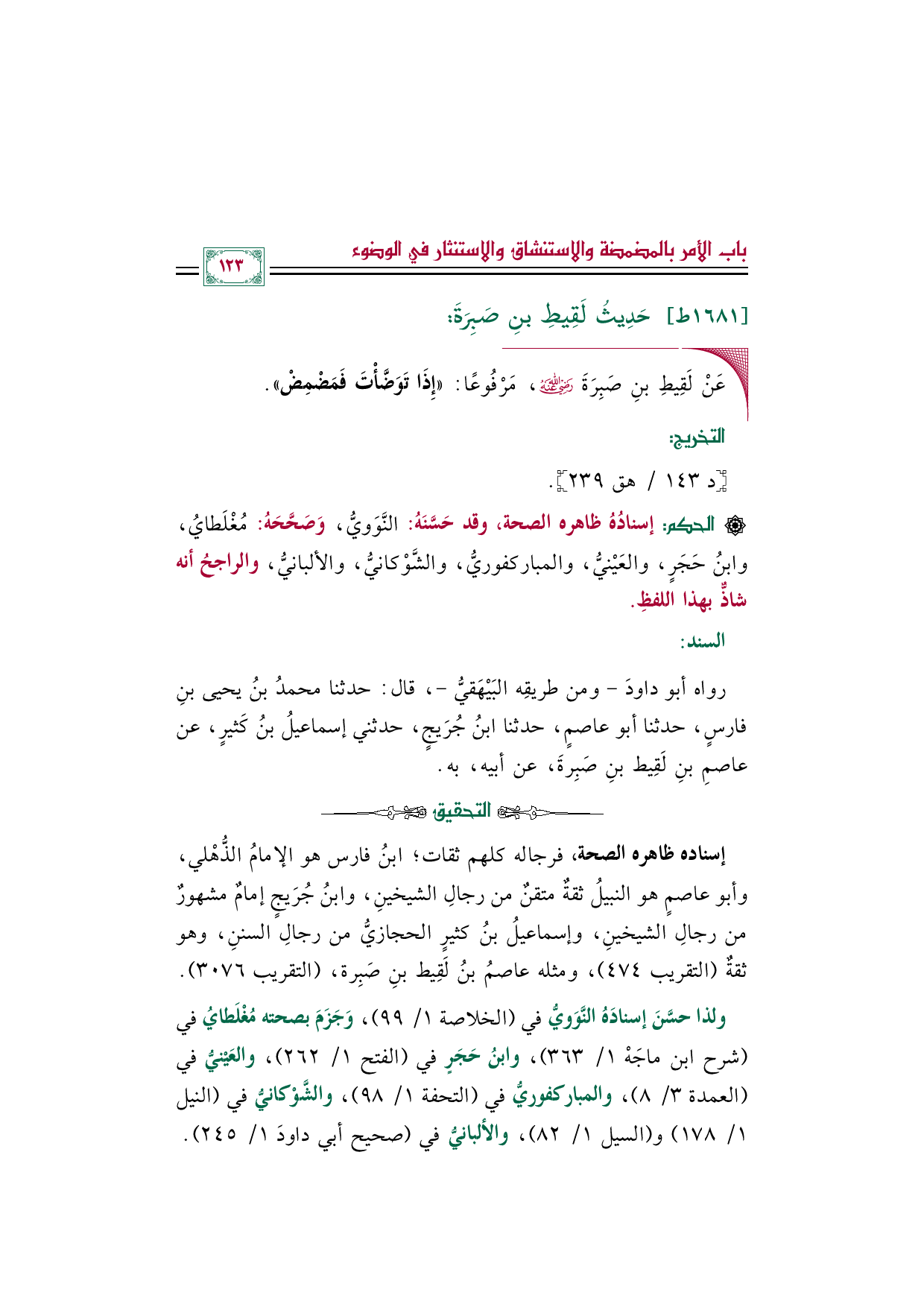 ولذا حسَّنَ إسنادَهُ النَّوَويُّ في (الخلاصة ١/ ٩٩)، وَجَزَمَ بصحته مُغْلَطايُ في (شرح ابن ماجَهْ ١/ ٣٦٣)، وابنُ حَجَرٍ في (الفتح ١/ ٢٦٢)، والعَيْنيُّ في (العمدة ٣/ ٨)، والمباركفوريُّ في (التحفة ١/ ٩٨)، والشَّوْكانيُّ في (النيل ١/ ١٧٨) و (السيل ١/ ٨٢)، والألبانيُّ في (صحيح أبي داودَ ١/ ٢٤٥).