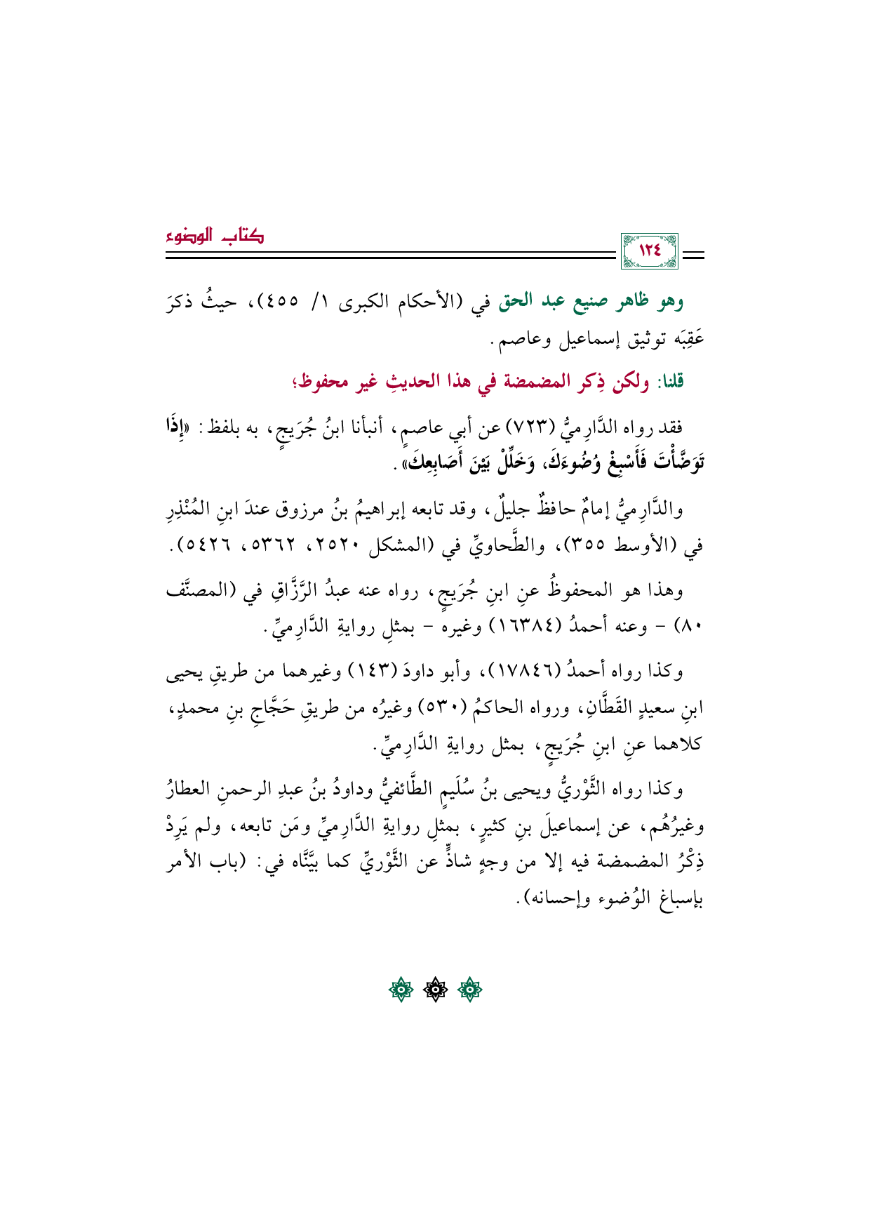 وكذا رواه الثَّوْريُّ ويحيى بنُ سُلَيمٍ الطَّائفيُّ وداودُ بنُ عبدِ الرحمنِ العطارُ وغيرُهُم، عن إسماعيلَ بنِ كثيرٍ، بمثلِ روايةِ الدَّارِميِّ ومَن تابعه، ولم يَرِدْ ذِكْرُ المضمضة فيه إلا من وجهٍ شاذٍّ عن الثَّوْريِّ كما بيَّنَّاه في: (باب الأمر بإسباغ الوُضوء وإحسانه).