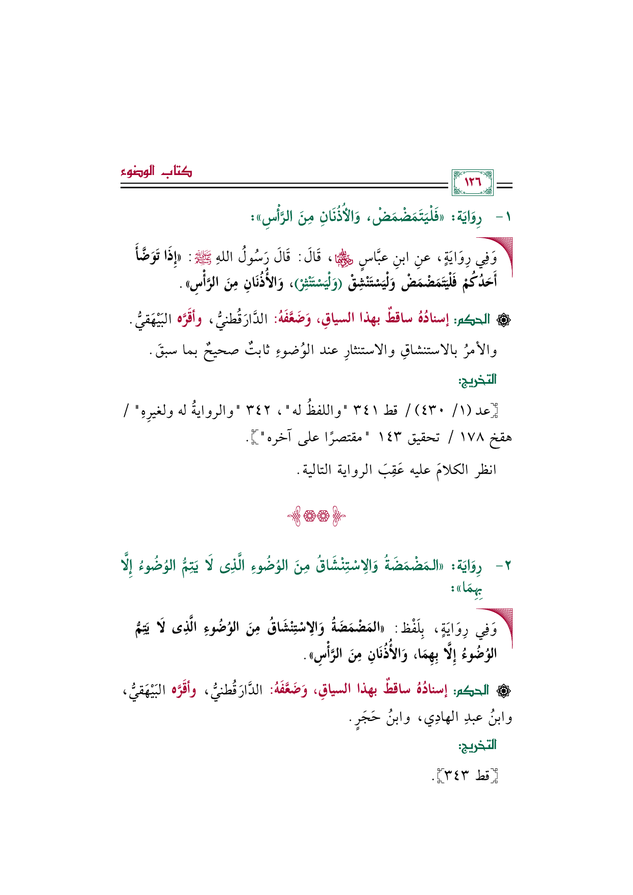 • وَفِي رِوَايَةٍ، عنِ ابنِ عبَّاسٍ رضي الله عنهما، قَالَ: قَالَ رَسُولُ اللهِ صلى الله عليه وسلم: «إِذَا تَوَضَّأَ أَحَدُكُمْ فَلْيَتَمَضْمَضْ وَلْيَسْتَنْشِقْ (وَلْيَسْتَنْثِرْ)، وَالأُذُنَانِ مِنَ الرَّأْسِ».