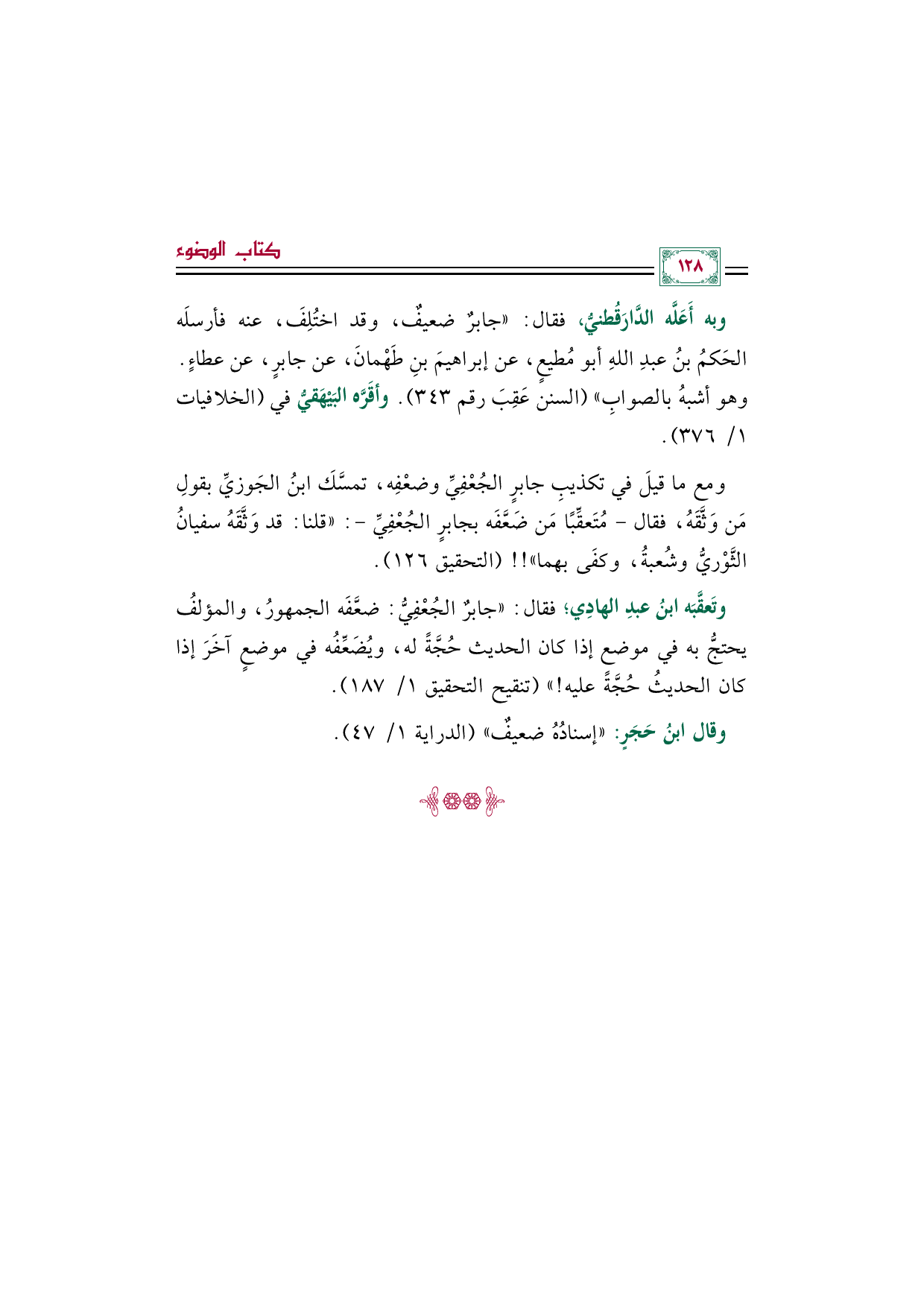وتَعقَّبَه ابنُ عبدِ الهادِي؛ فقال: "جابرٌ الجُعْفِيُّ: ضعَّفَه الجمهورُ، والمؤلفُ يحتجُّ به في موضع إذا كان الحديث حُجَّةً له، ويُضَعِّفُه في موضعٍ آخَرَ إذا كان الحديثُ حُجَّةً عليه! " (تنقيح التحقيق ١/ ١٨٧).
