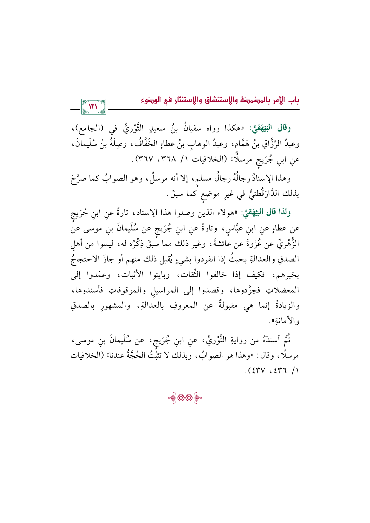 ثُمَّ أسندَهُ من روايةِ الثَّوْريِّ، عنِ ابنِ جُرَيجٍ، عن سُلَيمانَ بنِ موسى، مرسلًا، وقال: "وهذا هو الصوابُ، وبذلك لا تثبُتُ الحُجَّةُ عندنا" (الخلافيات ١/ ٤٣٦، ٤٣٧).