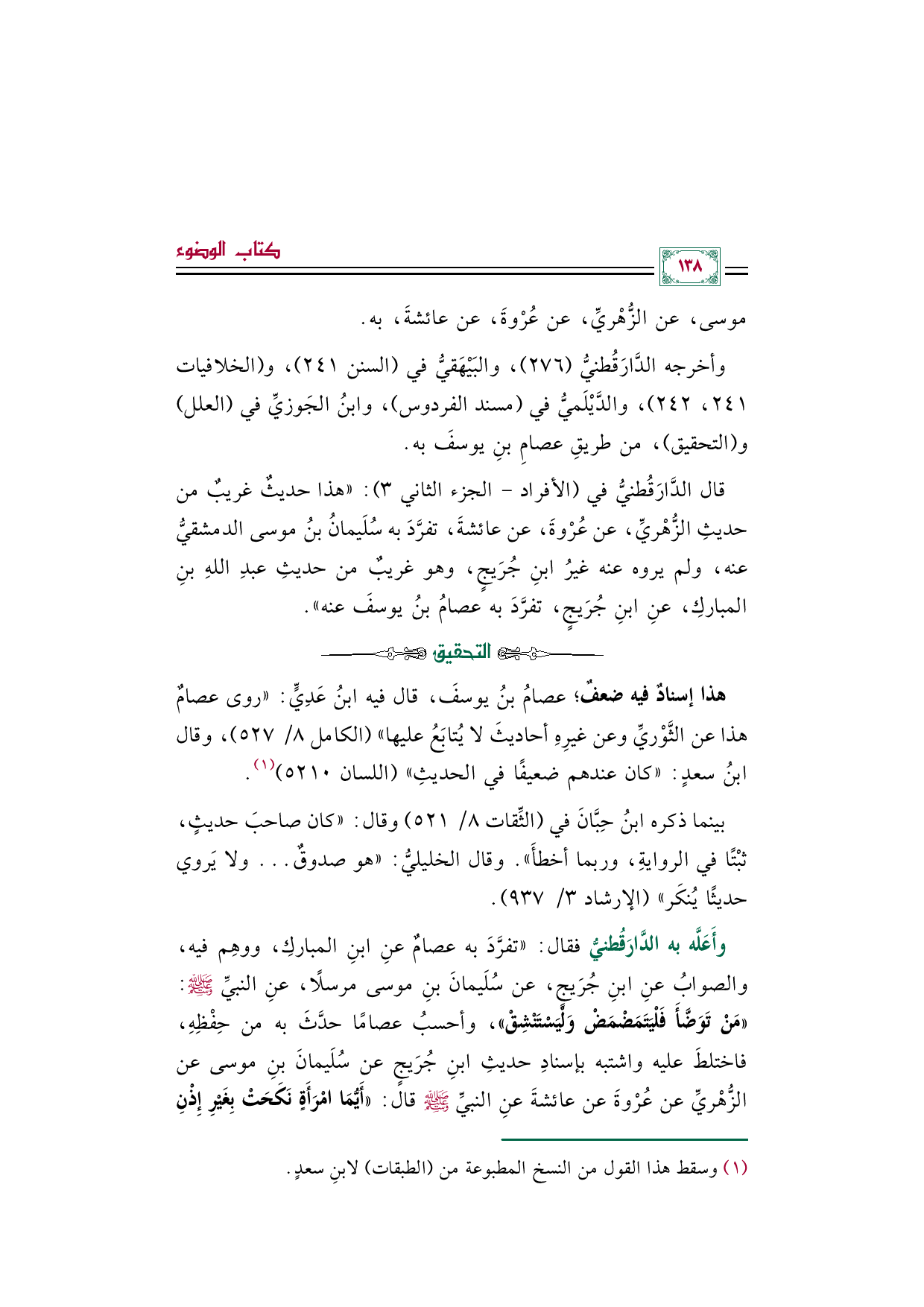 وأَعَلَّه به الدَّارَقُطنيُّ فقال: "تفرَّدَ به عصامٌ عنِ ابنِ المباركِ، ووهِم فيه، والصوابُ عنِ ابنِ جُرَيجٍ، عن سُلَيمانَ بنِ موسى مرسلًا، عنِ النبيِّ صلى الله عليه وسلم: ((مَنْ تَوَضَّأَ فَلْيَتَمَضْمَضْ وَلْيَسْتَنْشِقْ))، وأحسبُ عصامًا حدَّثَ به من حِفْظِهِ، فاختلطَ عليه واشتبه بإسنادِ حديثِ ابنِ جُرَيجٍ عن سُلَيمانَ بنِ موسى عن الزُّهْريِّ عن عُرْوةَ عن عائشةَ عنِ النبيِّ صلى الله عليه وسلم قال: ((أَيُّمَا امْرَأَةٍ نَكَحَتْ بِغَيْرِ إِذْنِ