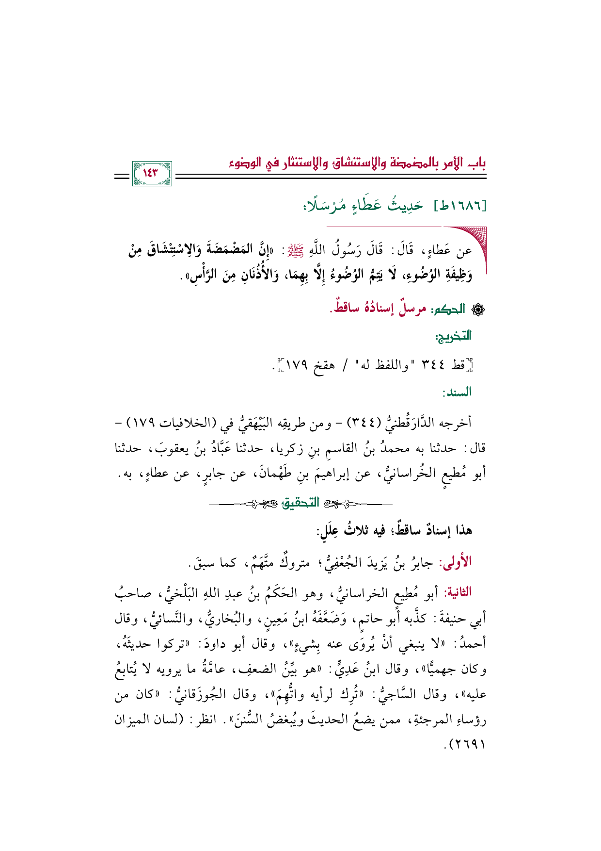 ◼ عن عَطاءٍ، قَالَ: قَالَ رَسُولُ اللَّهِ صلى الله عليه وسلم: «إِنَّ المَضْمَضَةَ وَالِاسْتِنْشَاقَ مِنْ وَظِيفَةِ الوُضُوءِ، لَا يَتِمُّ الوُضُوءُ إِلَّا بِهِمَا، وَالأُذُنَانِ مِنَ الرَّأْسِ».