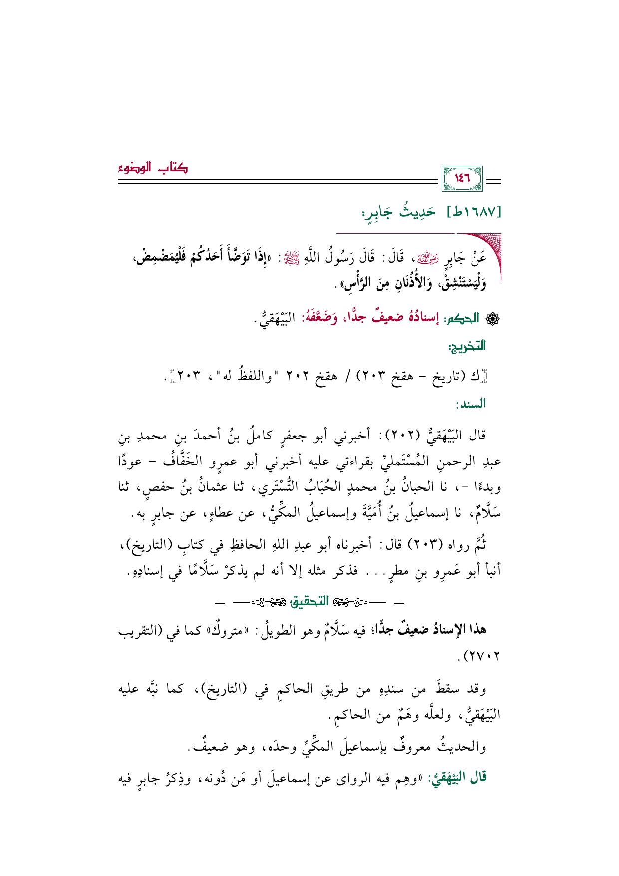 قال البَيْهَقيُّ (٢٠٢): أخبرني أبو جعفرٍ كاملُ بنُ أحمدَ بنِ محمدِ بنِ عبدِ الرحمنِ المُسْتَمليِّ بقراءتي عليه أخبرني أبو عمرٍو الخَفَّافُ -عودًا وبدءًا-، نا الحبانُ بنُ محمدٍ الحُبَابُ التُّسْتَري، ثنا عثمانُ بنُ حفصٍ، ثنا سَلَّامٌ، نا إسماعيلُ بنُ أُمَيَّةَ وإسماعيلُ المكِّيُّ، عن عطاءٍ، عن جابرٍ به.