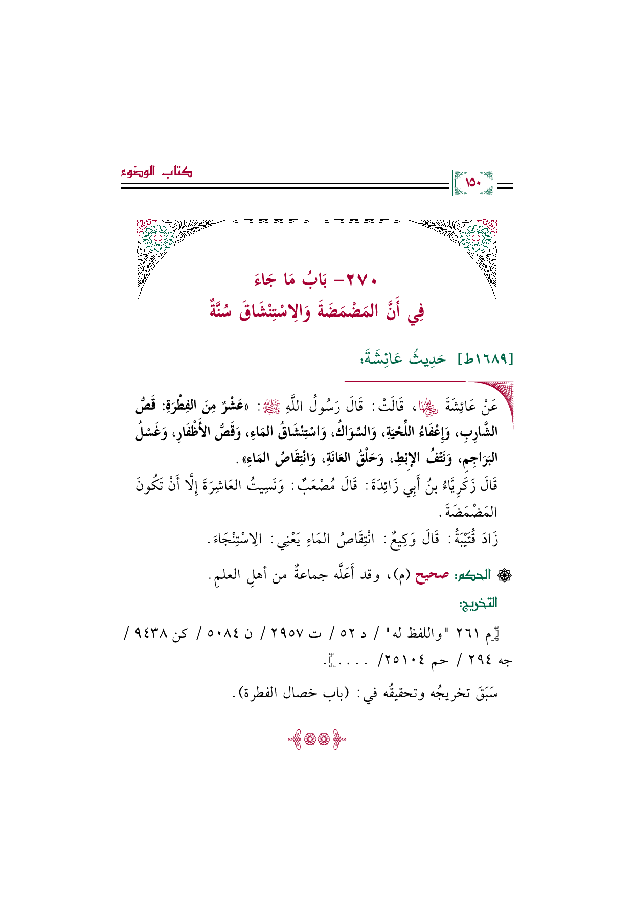 ◼ عَنْ عَائِشَةَ رضي الله عنها، قَالَتْ: قَالَ رَسُولُ اللَّهِ صلى الله عليه وسلم: «عَشْرٌ مِنَ الفِطْرَةِ: قَصُّ الشَّارِبِ، وَإِعْفَاءُ اللِّحْيَةِ، وَالسِّوَاكُ، وَاسْتِنْشَاقُ المَاءِ، وَقَصُّ الأَظْفَارِ، وَغَسْلُ البَرَاجِمِ، وَنَتْفُ الإِبْطِ، وَحَلْقُ العَانَةِ، وَانْتِقَاصُ المَاءِ».