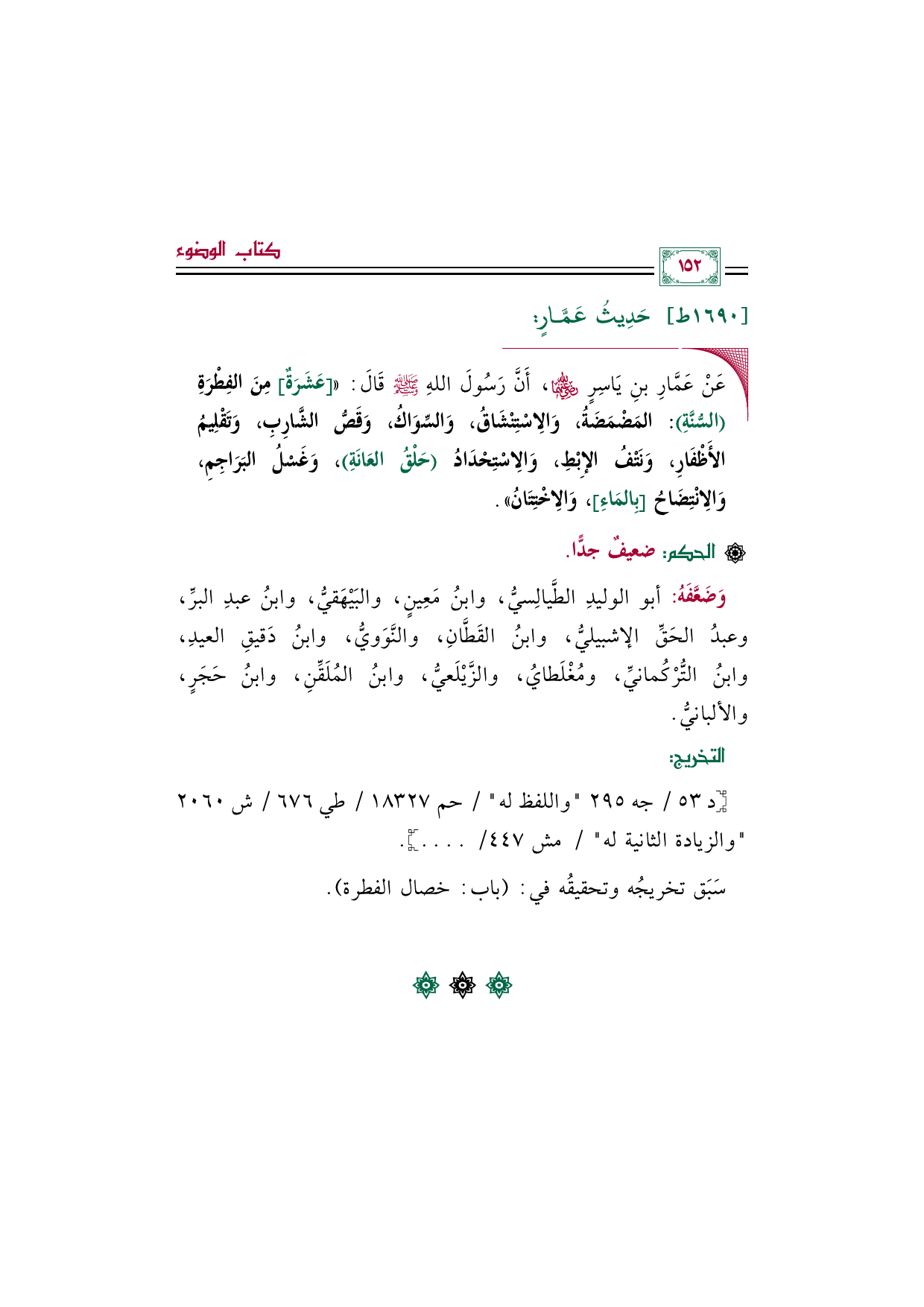 ◼ عَنْ عَمَّارِ بنِ يَاسِرٍ رضي الله عنهما، أَنَّ رَسُولَ اللهِ صلى الله عليه وسلم قَالَ: (([عَشَرَةٌ] مِنَ الفِطْرَةِ (السُّنَّةِ): المَضْمَضَةُ، وَالِاسْتِنْشَاقُ، وَالسِّوَاكُ، وَقَصُّ الشَّارِبِ، وَتَقْلِيمُ الأَظْفَارِ، وَنَتْفُ الإِبْطِ، وَالِاسْتِحْدَادُ (حَلْقُ العَانَةِ)، وَغَسْلُ البَرَاجِمِ، وَالِانْتِضَاحُ [بِالمَاءِ]، وَالِاخْتِتَانُ)).