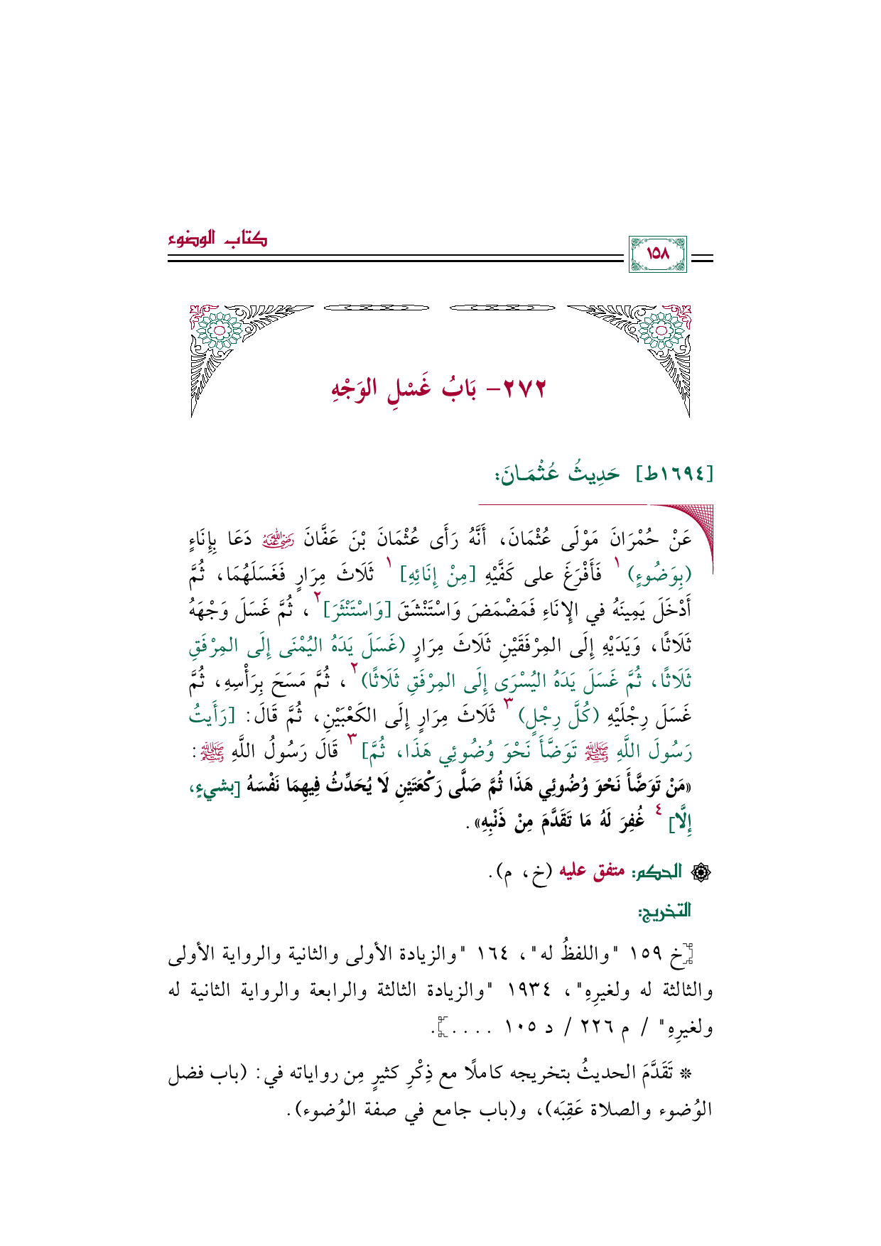 ◼ عَنْ حُمْرَانَ مَوْلَى عُثْمَانَ، أَنَّهُ رَأَى عُثْمَانَ بْنَ عَفَّانَ رضي الله عنه دَعَا بِإِنَاءٍ (بِوَضُوءٍ) ١ فَأَفْرَغَ على كَفَّيْهِ [مِنْ إِنَائِهِ] ١ ثَلَاثَ مِرَارٍ فَغَسَلَهُمَا، ثُمَّ أَدْخَلَ يَمِينَهُ في الإِنَاءِ فَمَضْمَضَ وَاسْتَنْشَقَ [وَاسْتَنْثَرَ] ٢، ثُمَّ غَسَلَ وَجْهَهُ ثَلَاثًا، وَيَدَيْهِ إِلَى المِرْفَقَيْنِ ثَلَاثَ مِرَارٍ (غَسَلَ يَدَهُ اليُمْنَى إِلَى المِرْفَقِ ثَلَاثًا، ثُمَّ غَسَلَ يَدَهُ اليُسْرَى إِلَى المِرْفَقِ ثَلَاثًا) ٢، ثُمَّ مَسَحَ بِرَأْسِهِ، ثُمَّ غَسَلَ رِجْلَيْهِ (كُلَّ رِجْلٍ) ٣ ثَلَاثَ مِرَارٍ إِلَى الكَعْبَيْنِ، ثُمَّ قَالَ: [رَأَيتُ رَسُولَ اللَّهِ - صلى الله عليه وسلم - تَوَضَّأَ نَحْوَ وُضُوئِي هَذَا، ثُمَّ] ٣ قَالَ رَسُولُ اللَّهِ صلى الله عليه وسلم: «مَنْ تَوَضَّأَ نَحْوَ وُضُوئِي هَذَا ثُمَّ صَلَّى رَكْعَتَيْنِ لَا يُحَدِّثُ فِيهِمَا نَفْسَهُ [بشيءٍ، إِلَّا] ٤ غُفِرَ لَهُ مَا تَقَدَّمَ مِنْ ذَنْبِهِ».