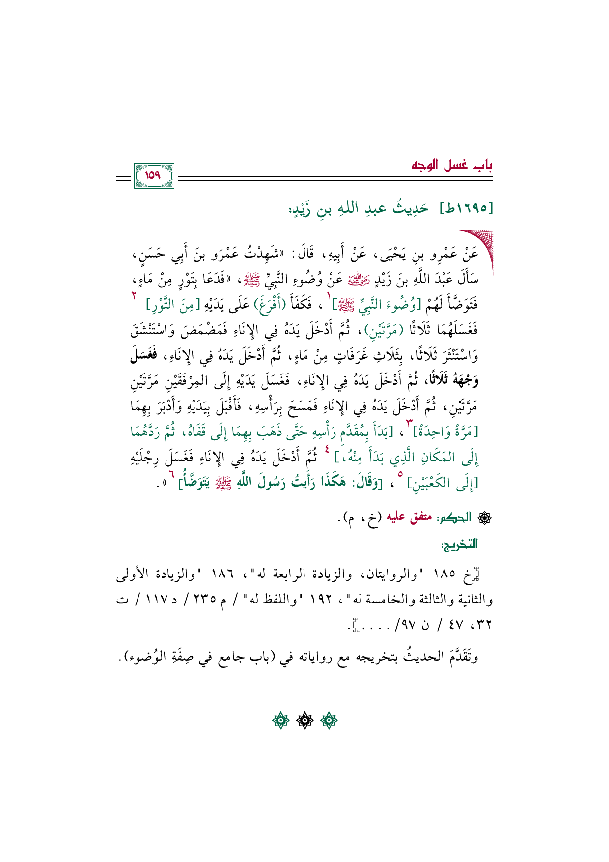 ◼ عَنْ عَمْرِو بنِ يَحْيَى، عَنْ أَبِيهِ، قَالَ: ((شَهِدْتُ عَمْرَو بنَ أَبِي حَسَنٍ، سَأَلَ عَبْدَ اللَّهِ بنَ زَيْدٍ رضي الله عنه عَنْ وُضُوءِ النَّبِيِّ صلى الله عليه وسلم، «فَدَعَا بِتَوْرٍ مِنْ مَاءٍ، فَتَوَضَّأَ لَهُمْ [وُضُوءَ النَّبِيِّ صلى الله عليه وسلم] ١، فَكَفَأَ (أَفْرَغَ) عَلَى يَدَيْهِ [مِنَ التَّوْرِ] ٢ فَغَسَلَهُمَا ثَلَاثًا (مَرَّتَيْنِ)، ثُمَّ أَدْخَلَ يَدَهُ فِي الإِنَاءِ فَمَضْمَضَ وَاسْتَنْشَقَ وَاسْتَنْثَرَ ثَلَاثًا، بِثَلَاثِ غَرَفَاتٍ مِنْ مَاءٍ، ثُمَّ أَدْخَلَ يَدَهُ فِي الإِنَاءِ، فَغَسَلَ وَجْهَهُ ثَلَاثًا، ثُمَّ أَدْخَلَ يَدَهُ فِي الإِنَاءِ، فَغَسَلَ يَدَيْهِ إِلَى المِرْفَقَيْنِ مَرَّتَيْنِ مَرَّتَيْنِ، ثُمَّ أَدْخَلَ يَدَهُ فِي الإِنَاءِ فَمَسَحَ بِرَأْسِهِ، فَأَقْبَلَ بِيَدَيْهِ وَأَدْبَرَ بِهِمَا [مَرَّةً وَاحِدَةً] ٣، [بَدَأَ بِمُقَدَّمِ رَأْسِهِ حَتَّى ذَهَبَ بِهِمَا إِلَى قَفَاهُ، ثُمَّ رَدَّهُمَا إِلَى المَكَانِ الَّذِي بَدَأَ مِنْهُ، ] ٤ ثُمَّ أَدْخَلَ يَدَهُ فِي الإِنَاءِ فَغَسَلَ رِجْلَيْهِ [إِلَى الكَعْبَيْنِ] ٥، [وَقَالَ: هَكَذَا رَأَيتُ رَسُولَ اللَّهِ صلى الله عليه وسلم يَتَوَضَّأُ] ٦)).