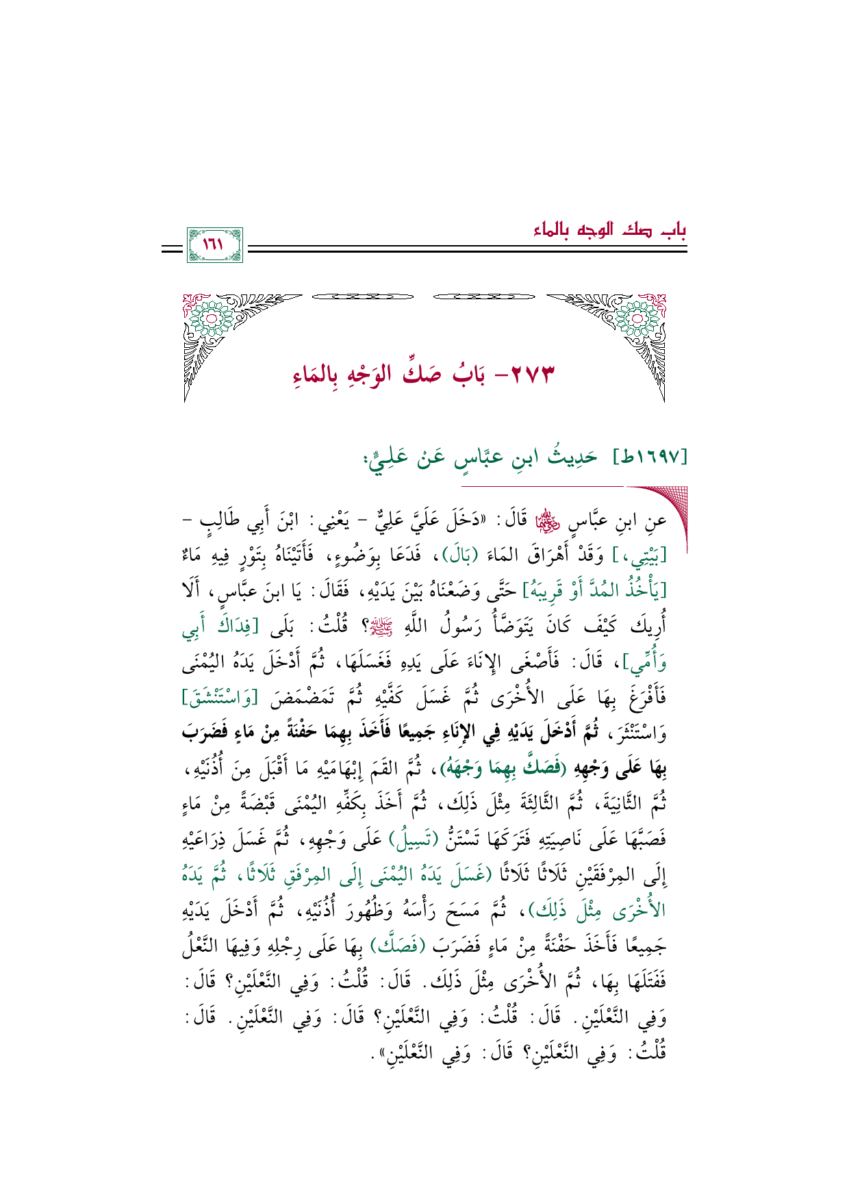 ◼ عنِ ابنِ عبَّاسٍ رضي الله عنهما قَالَ: ((دَخَلَ عَلَيَّ عَلِيٌّ -يَعْنِي: ابْنَ أَبِي طَالِبٍ-[بَيْتِي، ] وَقَدْ أَهْرَاقَ المَاءَ (بَالَ)، فَدَعَا بِوَضُوءٍ، فَأَتَيْنَاهُ بِتَوْرٍ فِيهِ مَاءٌ [يَأْخُذُ المُدَّ أَوْ قَرِيبَهُ] حَتَّى وَضَعْنَاهُ بَيْنَ يَدَيْهِ، فَقَالَ: يَا ابنَ عبَّاسٍ، أَلَا أُرِيكَ كَيْفَ كَانَ يَتَوَضَّأُ رَسُولُ اللَّهِ صلى الله عليه وسلم؟ قُلْتُ: بَلَى [فِدَاكَ أَبِي وَأُمِّي]، قَالَ: فَأَصْغَى الإِنَاءَ عَلَى يَدِهِ فَغَسَلَهَا، ثُمَّ أَدْخَلَ يَدَهُ اليُمْنَى فَأَفْرَغَ بِهَا عَلَى الأُخْرَى ثُمَّ غَسَلَ كَفَّيْهِ ثُمَّ تَمَضْمَضَ [وَاسْتَنْشَقَ] وَاسْتَنْثَرَ، ثُمَّ أَدْخَلَ يَدَيْهِ فِي الإِنَاءِ جَمِيعًا فَأَخَذَ بِهِمَا حَفْنَةً مِنْ مَاءٍ فَضَرَبَ بِهَا عَلَى وَجْهِهِ (فَصَكَّ بِهِمَا وَجْهَهُ)، ثُمَّ القَمَ إِبْهَامَيْهِ مَا أَقْبَلَ مِنَ أُذُنَيْهِ، ثُمَّ الثَّانِيَةَ، ثُمَّ الثَّالِثَةَ مِثْلَ ذَلِكَ، ثُمَّ أَخَذَ بِكَفِّهِ اليُمْنَى قَبْضَةً مِنْ مَاءٍ فَصَبَّهَا عَلَى نَاصِيَتِهِ فَتَرَكَهَا تَسْتَنُّ (تَسِيلُ) عَلَى وَجْهِهِ، ثُمَّ غَسَلَ ذِرَاعَيْهِ إِلَى المِرْفَقَيْنِ ثَلَاثًا ثَلَاثًا (غَسَلَ يَدَهُ اليُمْنَى إِلَى المِرْفَقِ ثَلَاثًا، ثُمَّ يَدَهُ الأُخْرَى مِثْلَ ذَلِكَ)، ثُمَّ مَسَحَ رَأْسَهُ وَظُهُورَ أُذُنَيْهِ، ثُمَّ أَدْخَلَ يَدَيْهِ جَمِيعًا فَأَخَذَ حَفْنَةً مِنْ مَاءٍ فَضَرَبَ (فَصَكَّ) بِهَا عَلَى رِجْلِهِ وَفِيهَا النَّعْلُ فَفَتَلَهَا بِهَا، ثُمَّ الأُخْرَى مِثْلَ ذَلِكَ. قَالَ: قُلْتُ: وَفِي النَّعْلَيْنِ؟ قَالَ: وَفِي النَّعْلَيْنِ. قَالَ: قُلْتُ: وَفِي النَّعْلَيْنِ؟ قَالَ: وَفِي النَّعْلَيْنِ. قَالَ: قُلْتُ: وَفِي النَّعْلَيْنِ؟ قَالَ: وَفِي النَّعْلَيْنِ)).