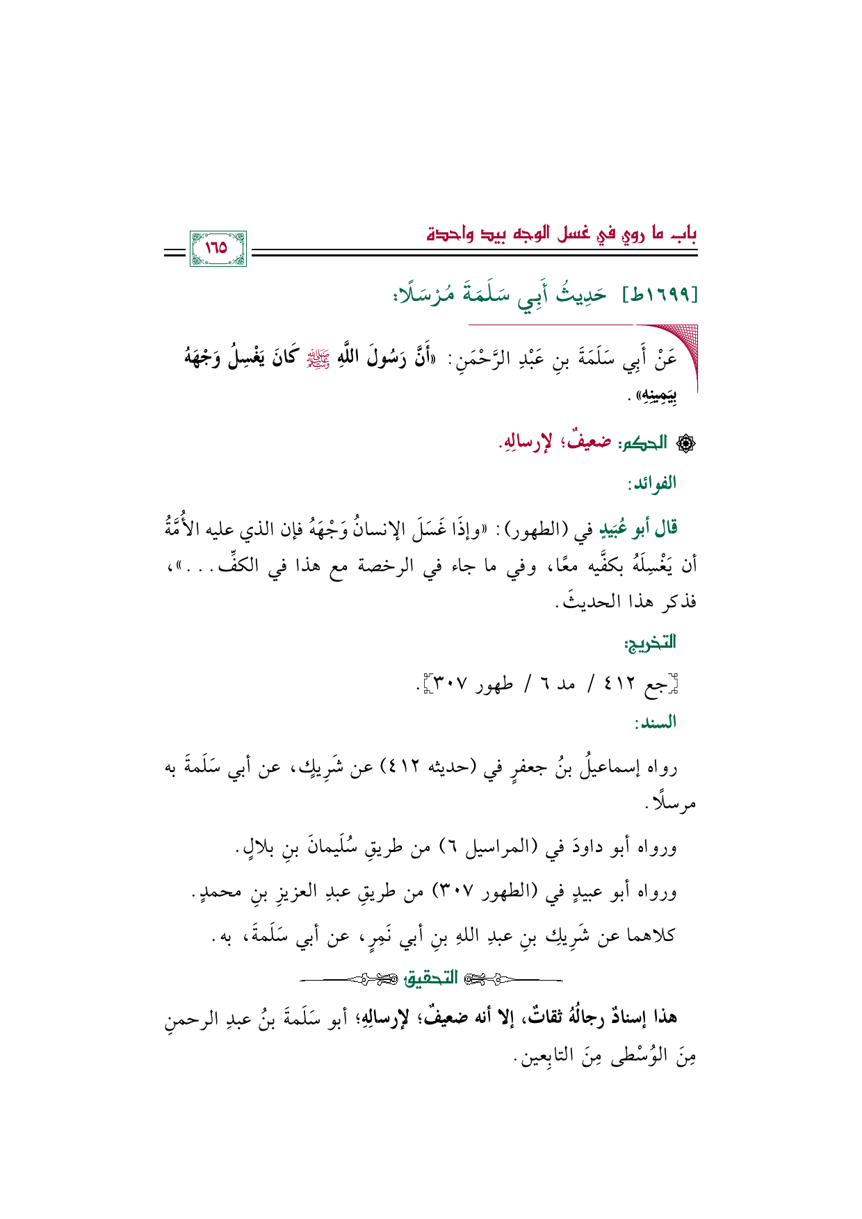 ◼ عَنْ أَبِي سَلَمَةَ بنِ عَبْدِ الرَّحْمَنِ: «أَنَّ رَسُولَ اللَّهِ صلى الله عليه وسلم كَانَ يَغْسِلُ وَجْهَهُ بِيَمِينِهِ».